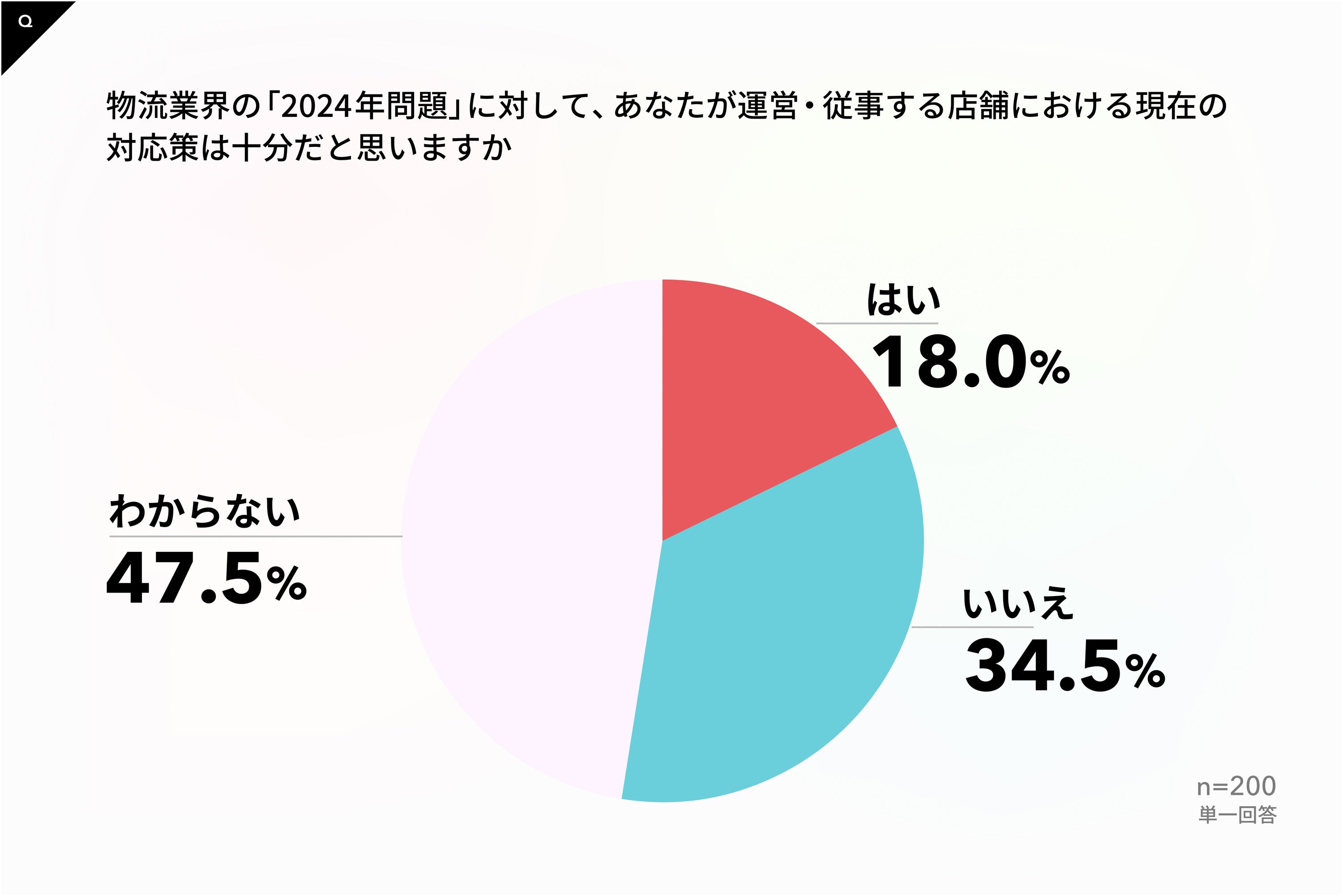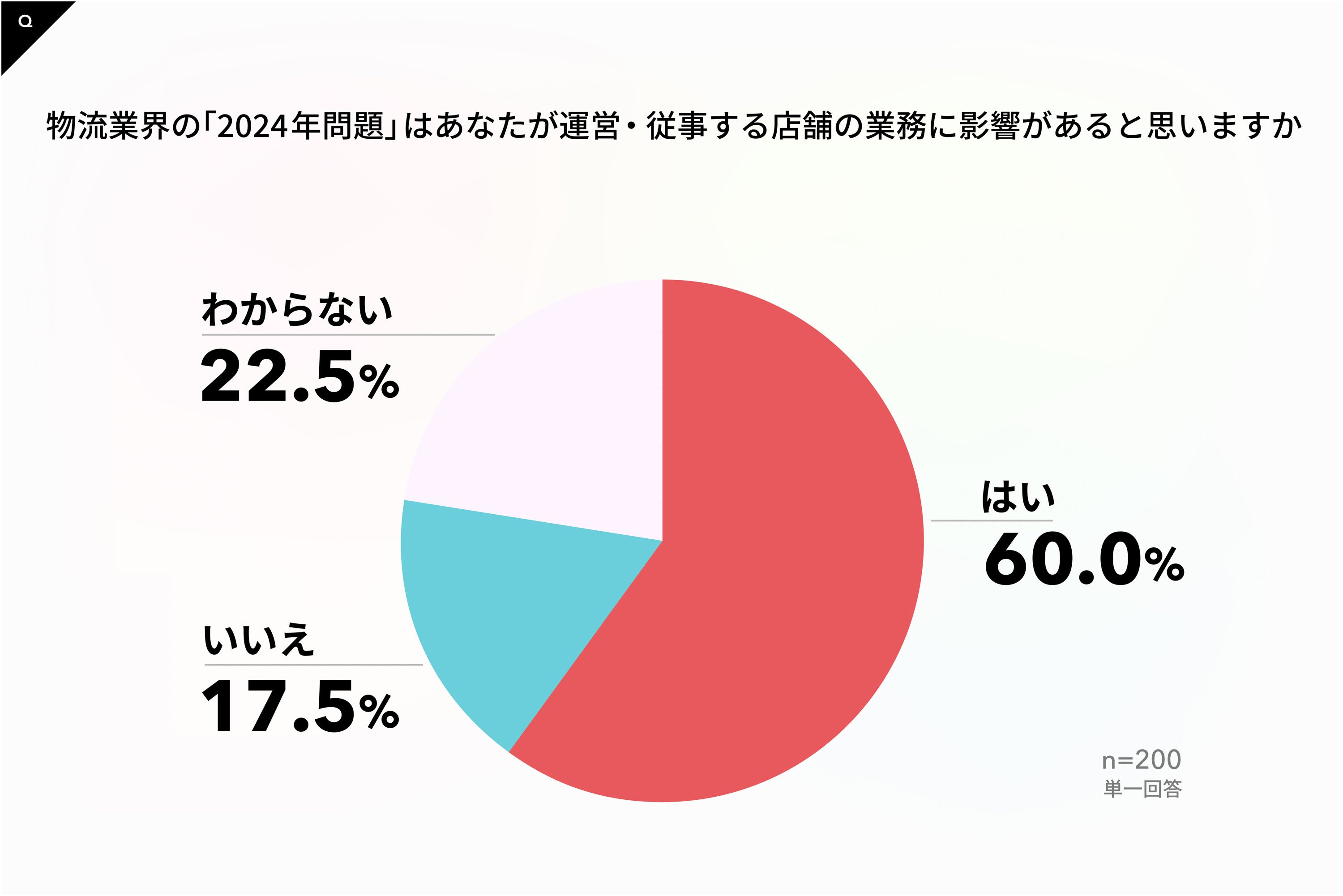 「2024年問題」は運営・従事する店舗の業務に影響があるか、の質問に対し60.0%が「はい」と回答。「わからない」と影響の有無を判断できないとした回答も22.5%あった。