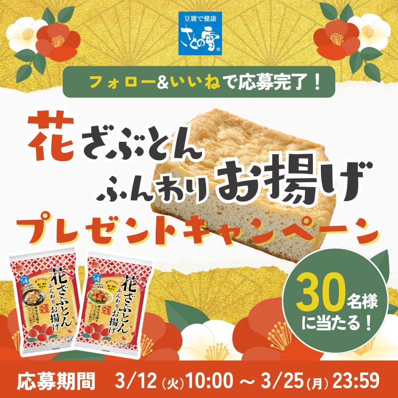 さとの雪食品株式会社(徳島県鳴門市/代表取締役社長:植田滋)は、「花ざぶとん ふんわりお揚げ」を、2024年3月6日(水)より全国(北海道・沖縄を除く)で新発売いたします。また、新発売を記念してさとの雪食品公式Instagramにてプレゼントキャンペーンを実施いたします。