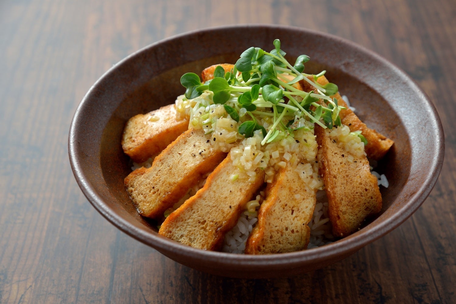 ぶ厚くて大きな油揚げを使ったステーキ丼です!酸味のある「ねぎ塩たれ」が「焼肉のたれ」で味付けした油揚げにぴったりでご飯が進みます。たんぱく質もしっかり摂れるボリューム満点の一品♪