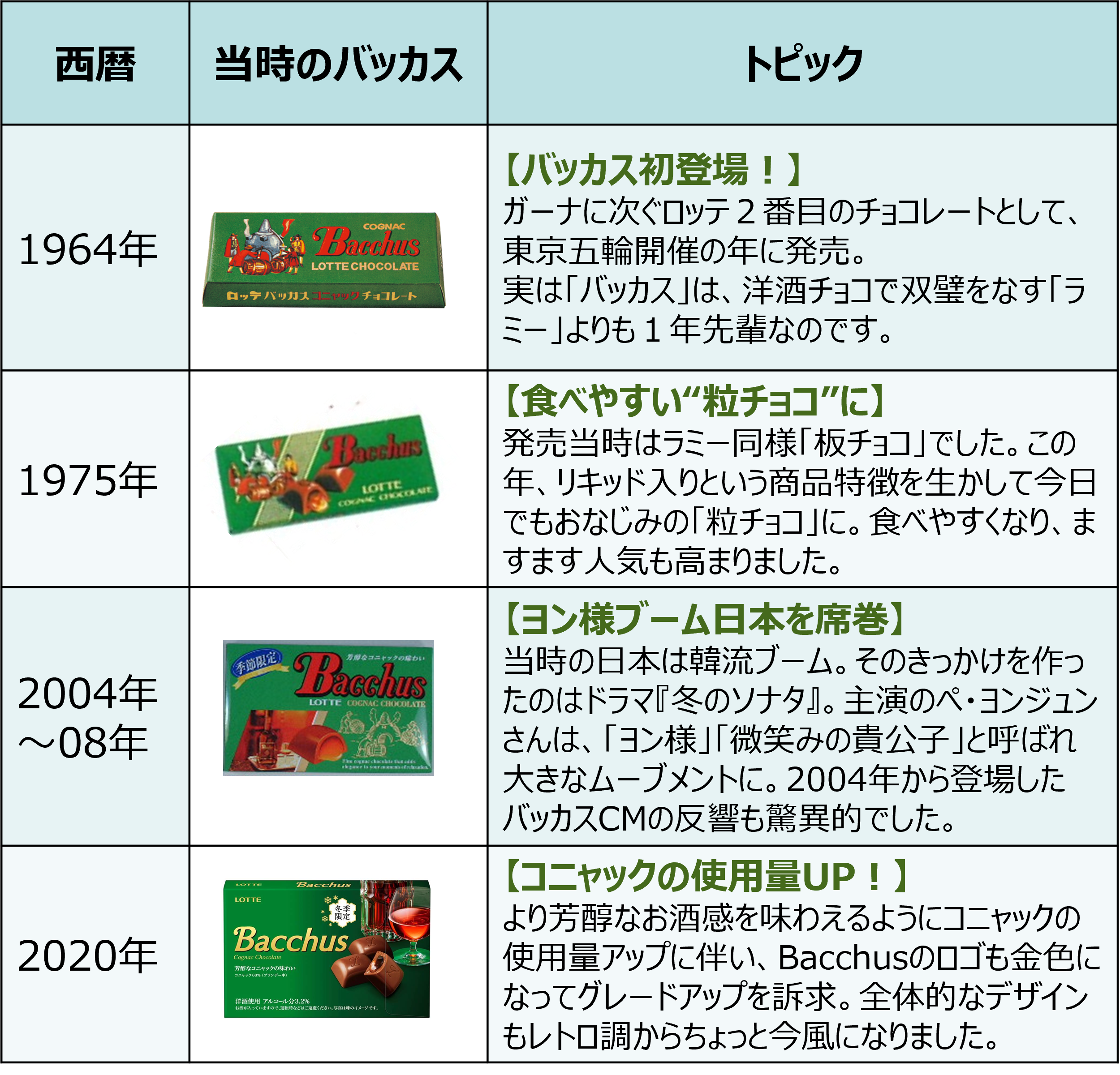 1964年、ロッテチョコレート事業黎明期に誕生した「バッカス」。現在にいたるまでのトピックスを簡単にご紹介します。