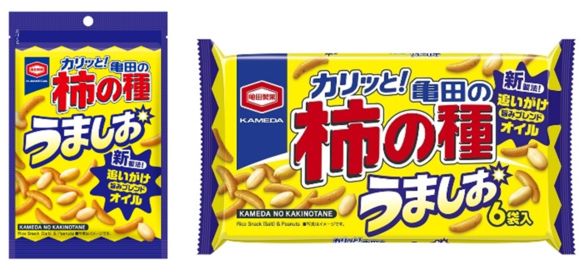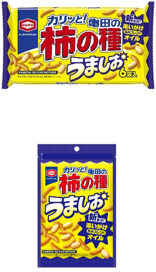 『亀田の柿の種 うましお』は、「亀田の柿の種」ならではのカリッと食感はそのままに、ぽいぽい食べ続けられる、これまでとはひと味ちがう“しお味”の「亀田の柿の種」です。新製法“オイルがけ”を用い、従来品では表現しきれなかった旨みたっぷりな味わいを実現しました。ガーリックやネギをきかせた特製旨みブレンドオイルを追いがけすることで、唐辛子のピリッとした辛味は控えめにしながらも、満足感のある旨味たっぷりな味に仕上げました。家族みんなのシン・ど定番として様々なシーンでお楽しみください。