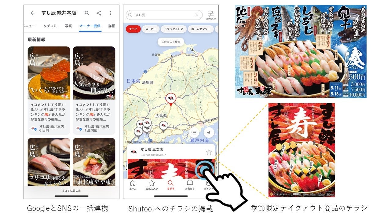今回、夏季・冬季の季節限定商品における施策として、「Shufoo!」でテイクアウト商品の訴求を行い、SNSでも各店舗統一した情報発信を行いました。その情報を「Local ONE」を使って、Google上の店舗情報欄にも連携させると、導入した8月には「すし辰」6店舗の平均販売個数が前年対比120%になりました。さらに年末年始には、広島県の県北にある三次(みよし)地域での反響が特に大きく、店舗全体売上げに対する同商品の売上比率が夏季に販売した同商品の2倍に。三次は遠方からの帰省が多い地域のため、年末年始という時期に加えて、折り込みチラシを見た父母世代、「Shufoo!」やSNSを見る子ども・孫世代といったように情報の露出方法を組み合わせた展開が大きな効果をもたらしたと考えられます。また結果が出たことで労力のかかる季節限定商品の開発・販売を行う従業員のモチベーションも大きく上がりました。
