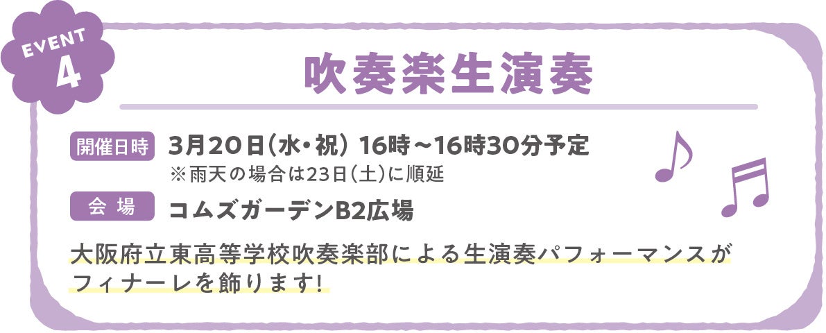 地元、大阪府立東高等学校吹奏楽部が、スタンディング形式による吹奏楽の生演奏パフォーマンスを披露し、コムズの34周年イベントのフィナーレを華やかに飾ります。