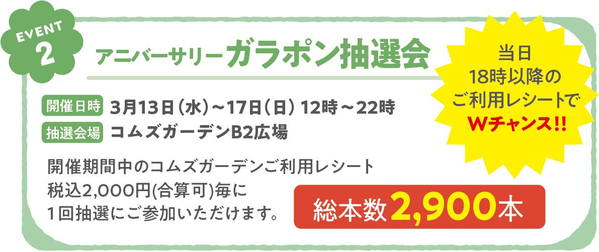 【参加条件】開催期間中のコムズガーデンご利用レシート税込2,000円(合算可)毎に1回抽選にご参加いただけます。