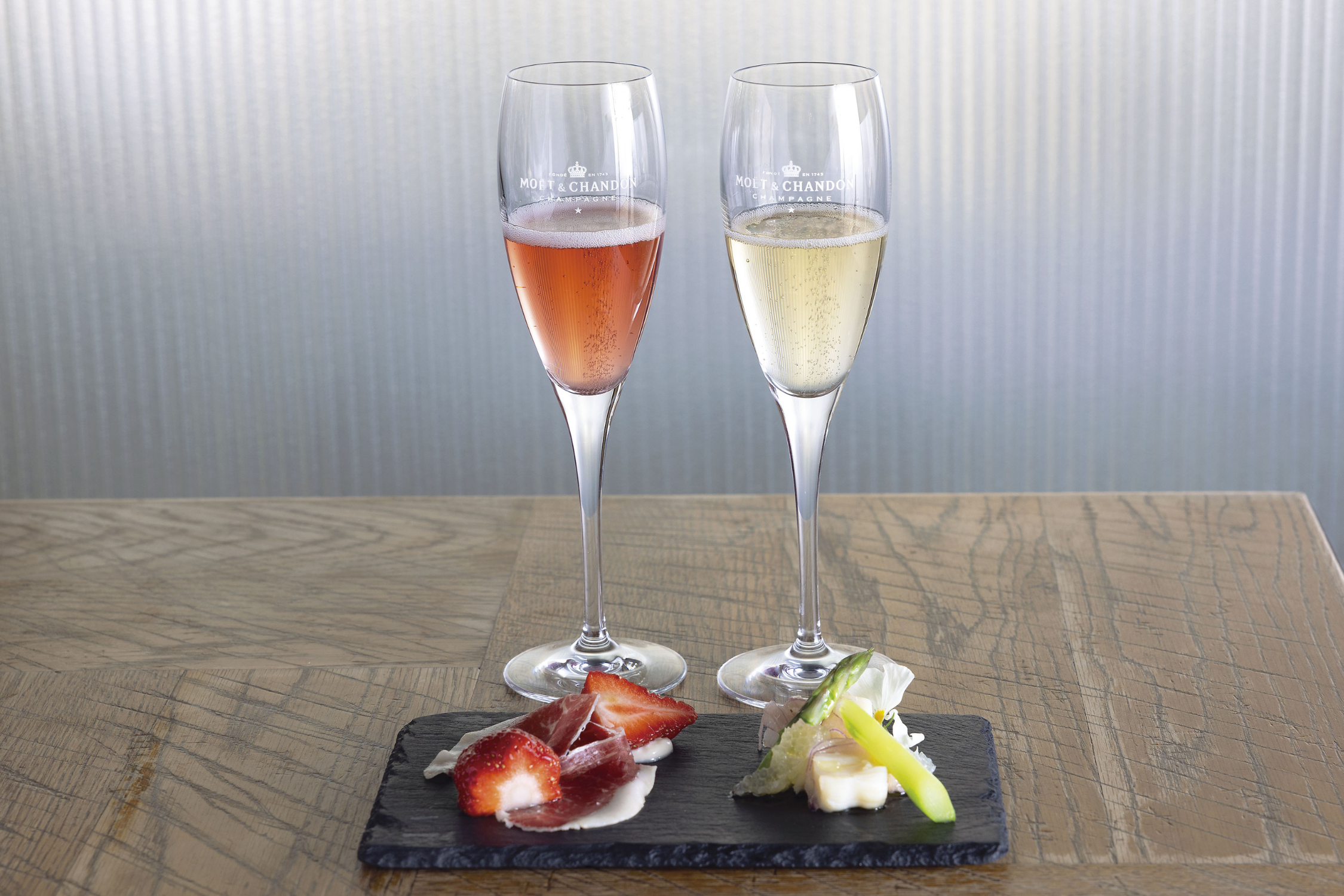 グリーンアスパラガスやあまおう苺など、春の味覚を味わえる水野翔太シェフが考案したアミューズと、「モエ・エ・シャンドン モエ アンペリアル」、「モエ・エ・シャンドン ロゼ アンペリアル」をそれぞれグラスで楽しめる限定のセットメニュー。