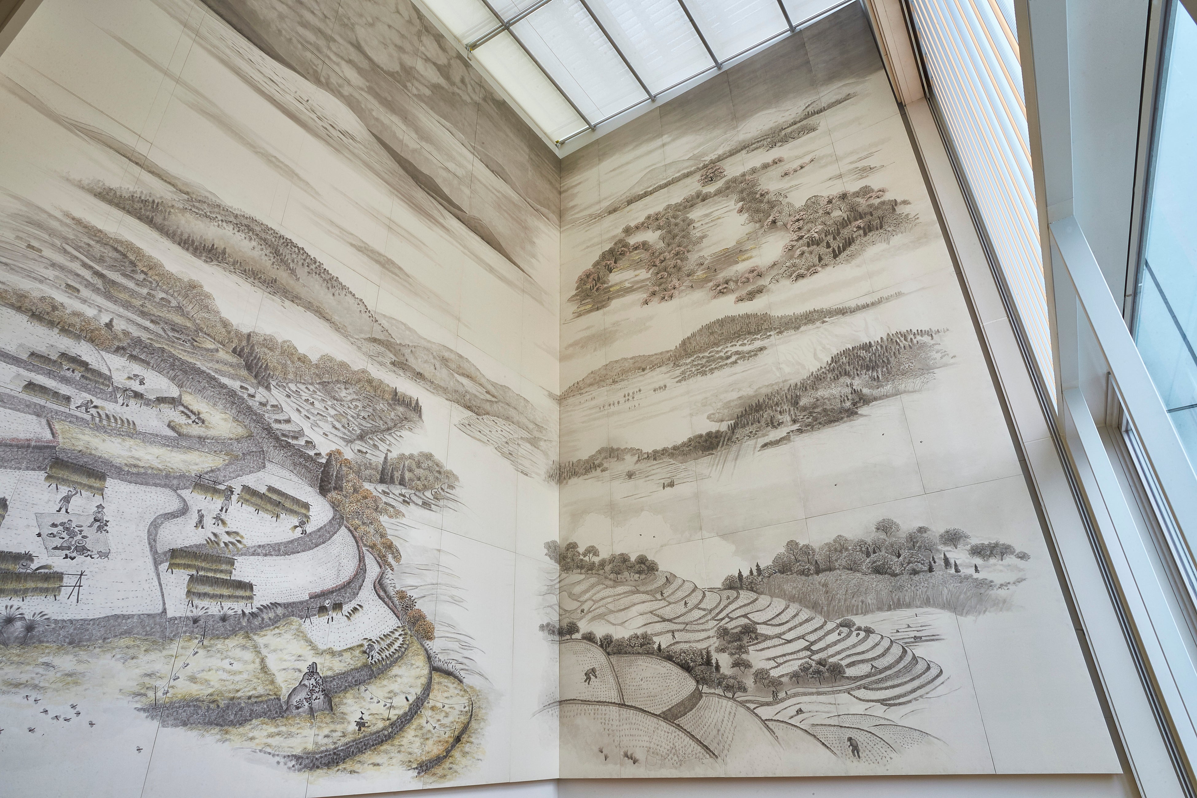 日本の美しい四季の中にある棚田を、細川護熙氏が墨絵で描いた作品「棚田の四季」。2m×1mの大きさの和紙60枚によって構成され、見る面や高さによって風景と四季が変わる表情豊かな作品です。米文化継承活動のシンボルとなる、天高8mの壮大な壁画です。