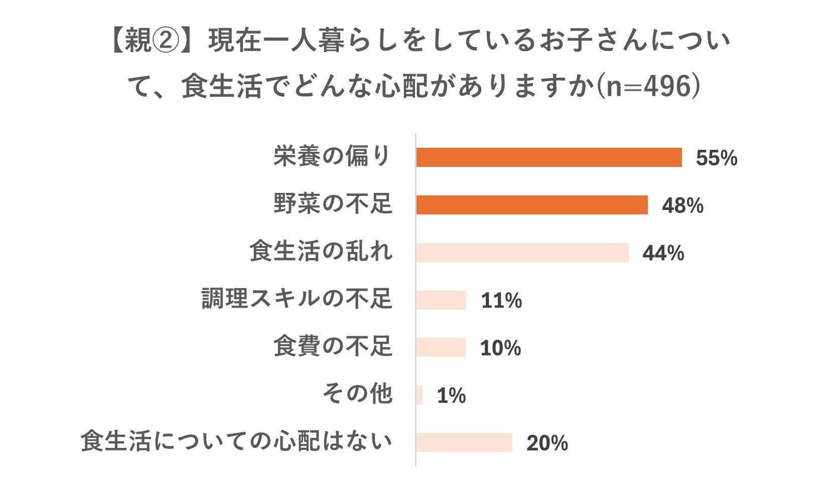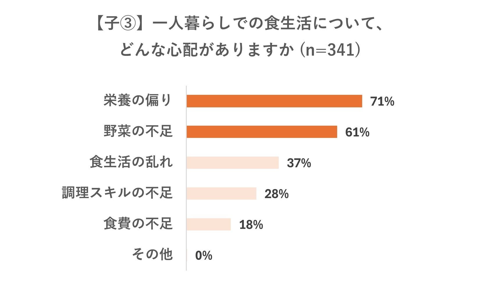 親に子どもの食生活に対する心配事を聞くと、55%が「栄養の偏り」、48%が「野菜の不足」と、栄養がしっかりととれているかという点に回答が集まりました(親②)。子ども自身も69%が一人暮らしでの食生活に心配があると回答し(子②)、その具体的な心配事は71%が「栄養の偏り」、61%が「野菜の不足」で(子③)、親と子の心配事が全く同じことが分かりました。