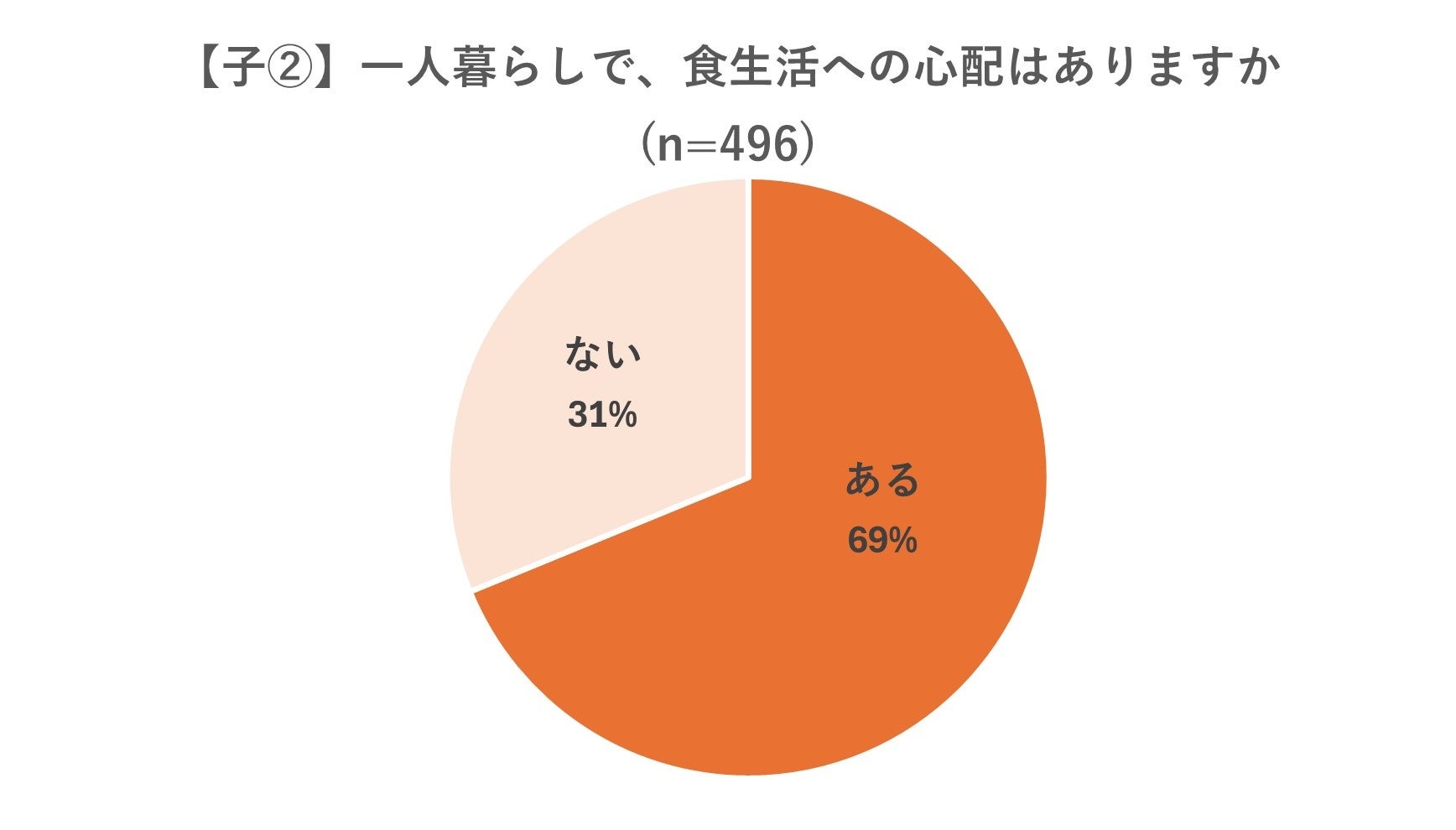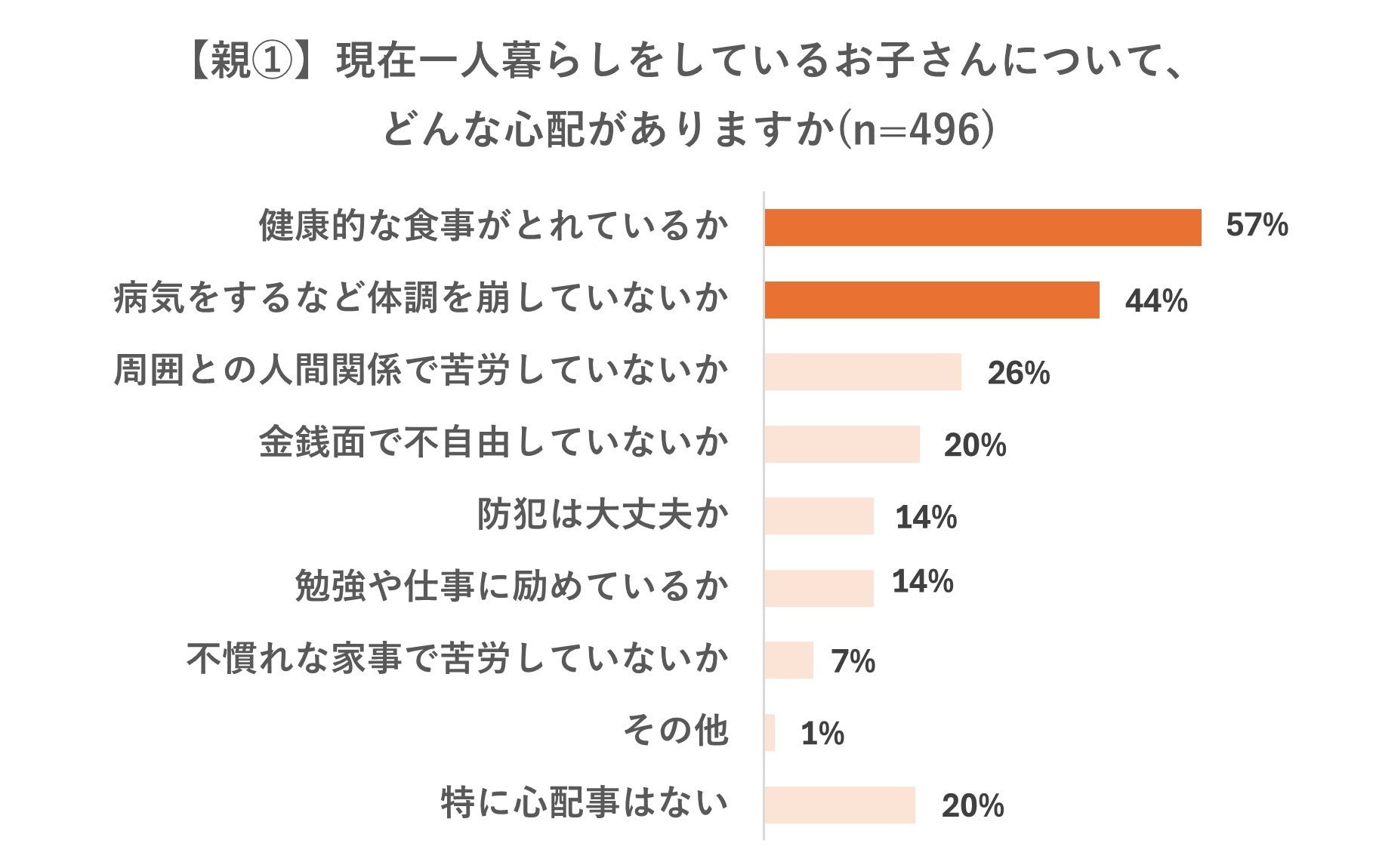 子どもに一人暮らしを始めたきっかけを聞くと、29%が「進学のため」、36%が「就職のため」と回答。65%が環境の変化とともに一人暮らしを始めることが分かりました(子①)。親に、子どもへの心配事があるかを聞くと、57%が「健康的な食事がとれているか」、44%が「病気をするなど体調を崩していないか」と回答し、健康面への心配に多くの回答が集まりました(親①)。