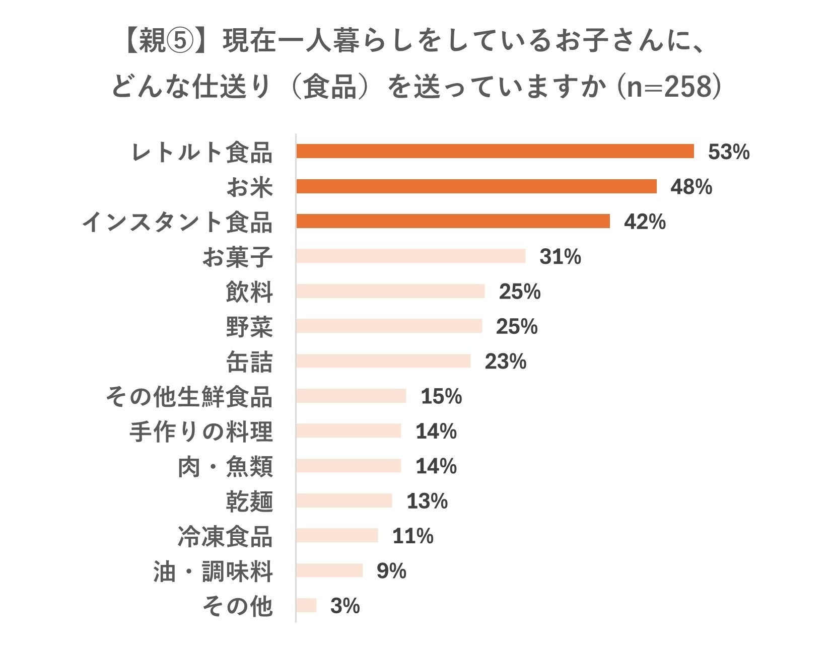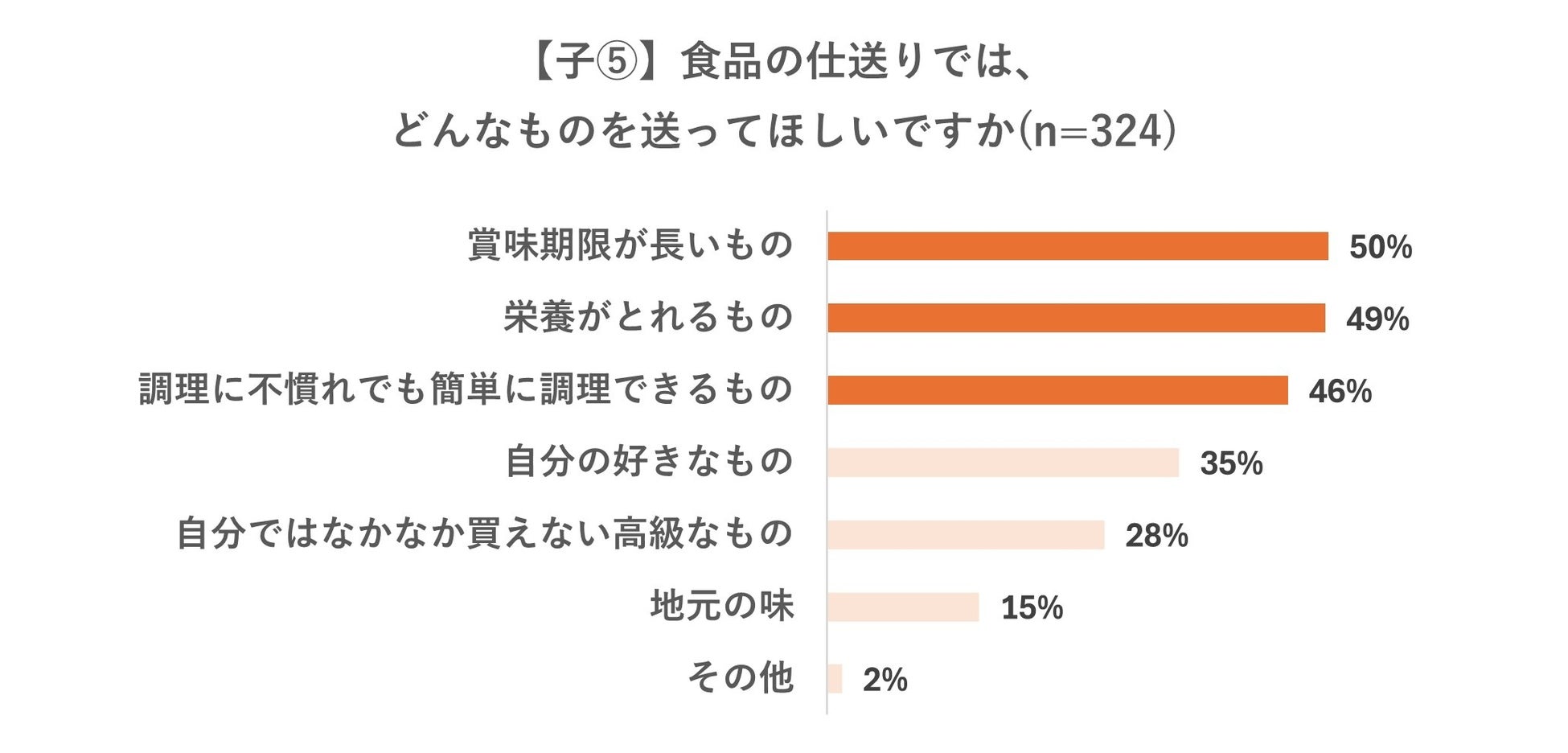 仕送りを希望する子どもに仕送りで送ってほしい食品を聞くと、半数近くが「賞味期限が長いもの」「栄養がとれるもの」「調理に不慣れでも簡単に調理できるもの」と回答しました(子⑤)。一人暮らしの食生活への子どもの心配事で、「栄養の偏り」(71%)と「野菜の不足」(61%)に特に回答が集まった点も踏まえると(子③)、子どもにとっての理想の仕送りは、野菜などがたっぷり入っているなど栄養がたっぷりとれて、調理の手間や賞味期限の心配がない食品ということが分かりました。