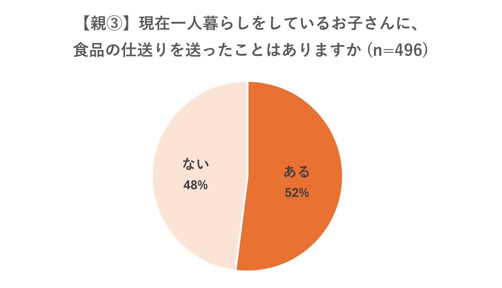 仕送りとして食品を送ったことがある親は全体の52%で(親③)、頻度は「数ヶ月に1回程度」という回答が最多の38%で、月に1回以上の高頻度での送付は38%でした(親④)。一方、仕送りを希望する子どもにその理想の頻度を聞くと、月に1回以上の高頻度での送付希望が65%となり(子④)、現実の仕送り頻度に対して理想の頻度の方が高いことが分かりました。