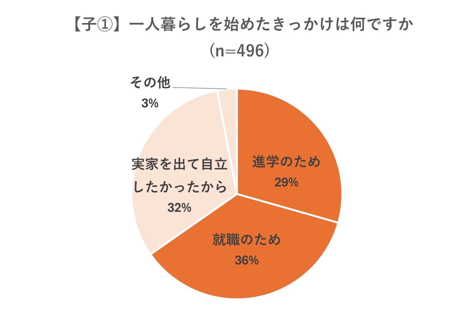 65%が進学・就職という環境の変化をきっかけに一人暮らしを開始。親の心配事は子どもの健康面に回答が集中。
