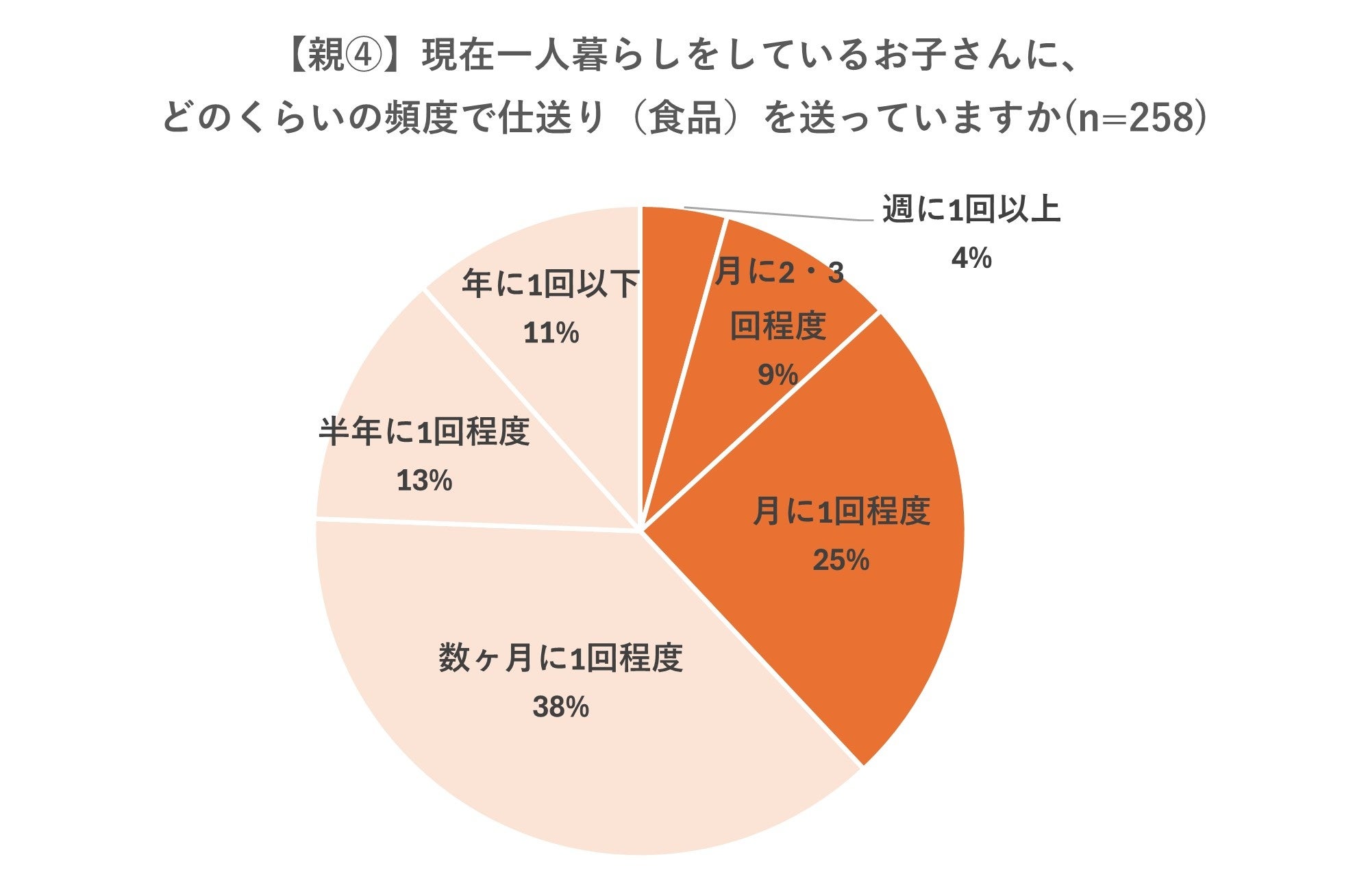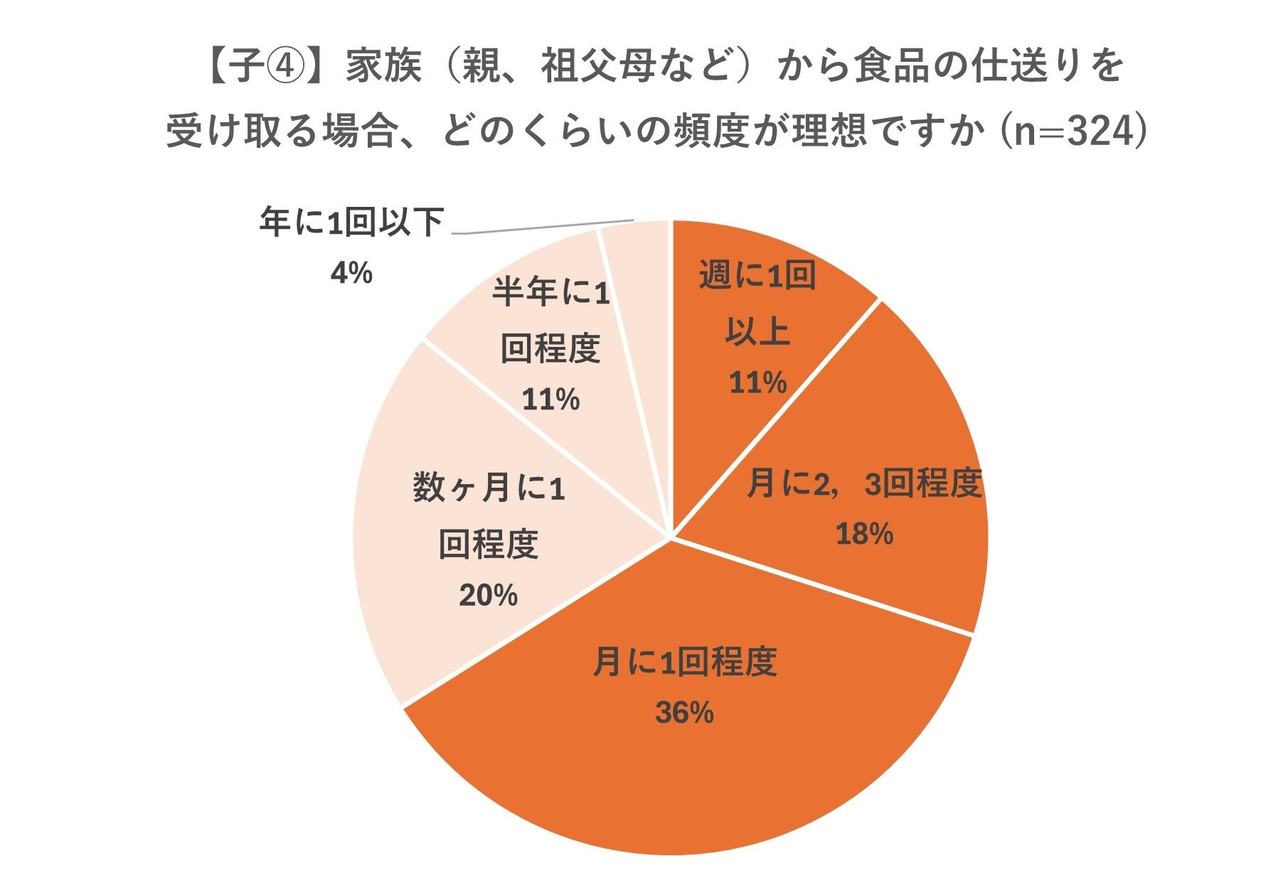仕送りとして食品を送ったことがある親は全体の52%で(親③)、頻度は「数ヶ月に1回程度」という回答が最多の38%で、月に1回以上の高頻度での送付は38%でした(親④)。一方、仕送りを希望する子どもにその理想の頻度を聞くと、月に1回以上の高頻度での送付希望が65%となり(子④)、現実の仕送り頻度に対して理想の頻度の方が高いことが分かりました。