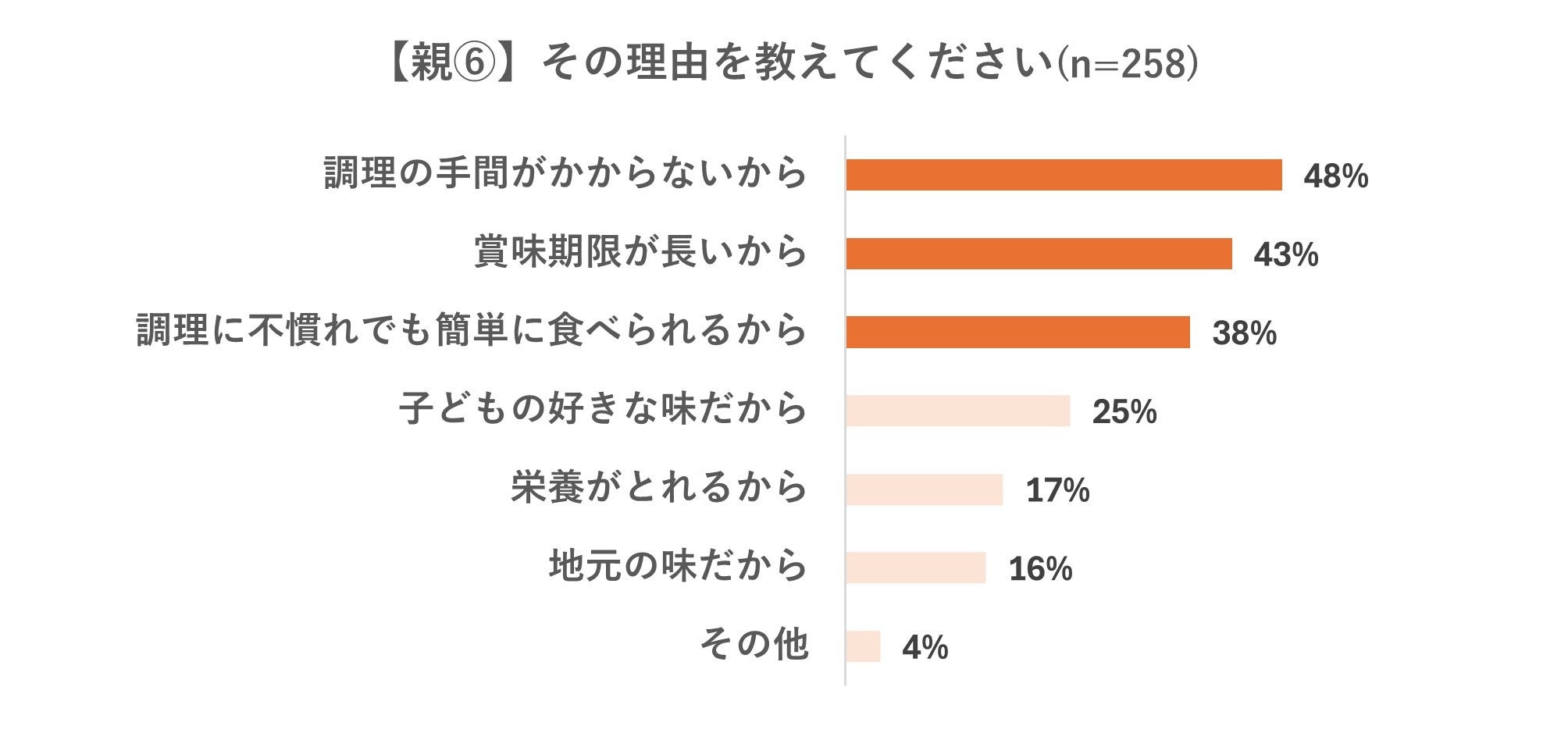 仕送りを送っている親に何を仕送りしているか聞いたところ、上位3位が、53%で「レトルト食品」、48%で「お米」、42%で「インスタント食品」で(親⑤)、食品の選定理由上位には、「調理の手間がかからないから」が48%、「賞味期限が長いから」が43%、「調理に不慣れでも簡単に食べられるから」が38%でした(親⑥)。