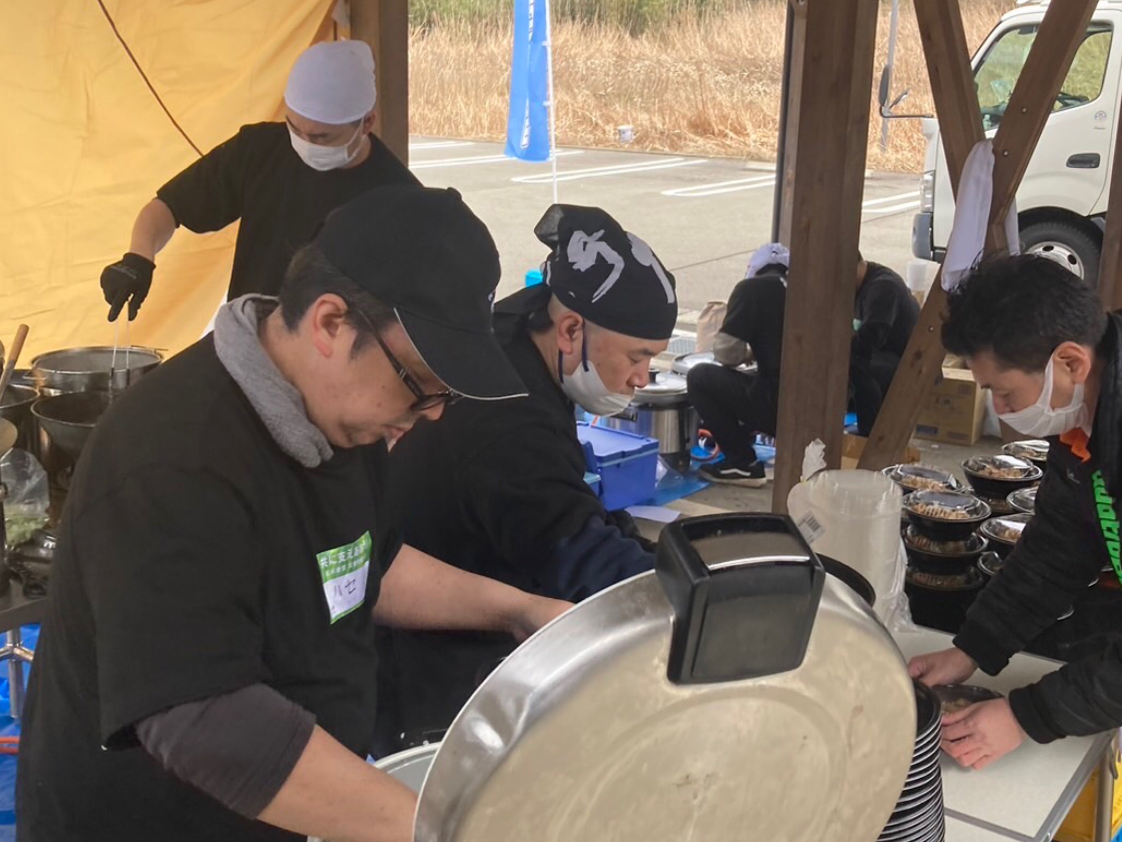 炊き出し2日目は、すた丼500食、カレー250食、豚汁400食を提供いたしました。2日目は初日以上にたくさんの方々にお越しいただき、さらに想定を上回るほどの提供数となりました。混雑して一時お待ちいただいてしまう場面もありましたが、現地の方のご支援・ご協力のおかげでお越しいただいた皆様に配り終えることができました。