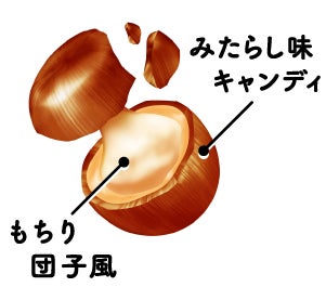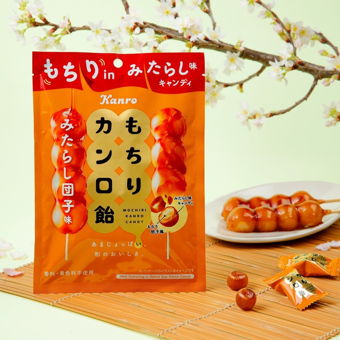 カンロ飴のあまじょっぱい味わいを活かしたみたらし味の飴の中に、団子をイメージしたもちもち食感の「もちり団子風」のセンターをたっぷりと入れることで、“外はパリッと、中はもちっ”の新食感をお楽しみいただけます。