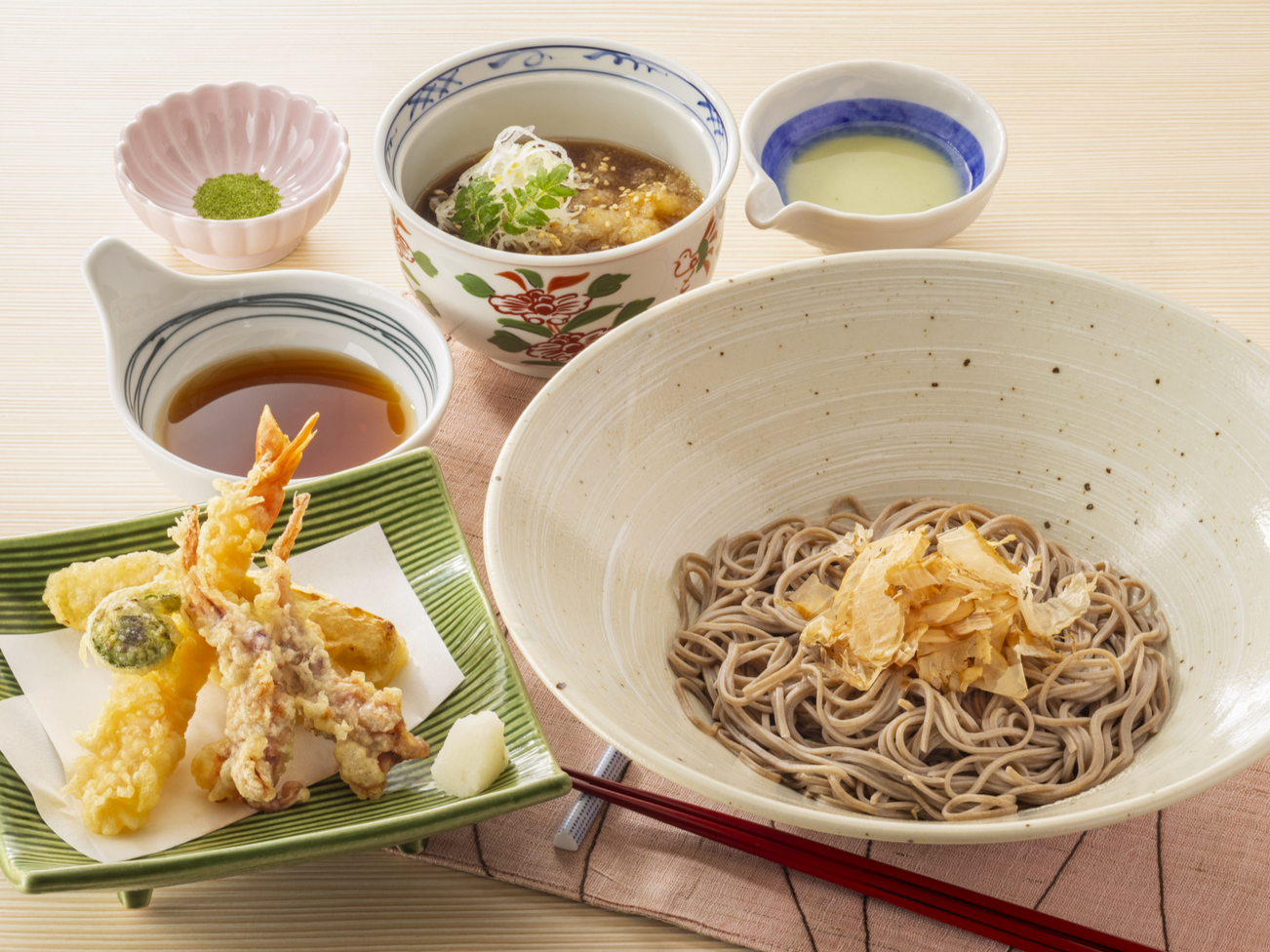 ほたるいか・こごみなどの春素材の天ぷらと、木の芽・花かつお・わさびなどの風味豊かなつゆで食べる自家製生(なま)そばをご堪能いただけます。
