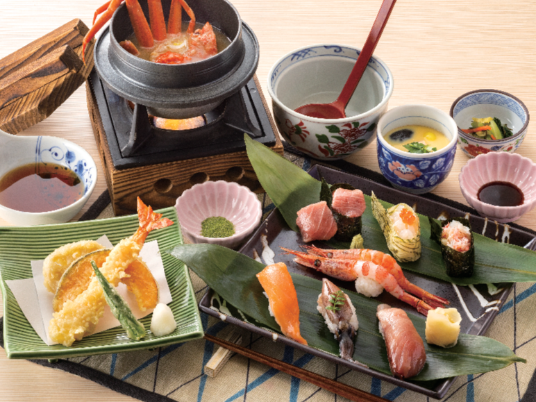 富山県産白えび、ほたるいか、ぶりなど7種の寿司と、新潟県産せいこがにの旨味たっぷりの釜ゆで汁、天ぷらも楽しめる御膳です。お彼岸など、ご家族のお集まりや各種会合等のお席にもピッタリのラインアップです。