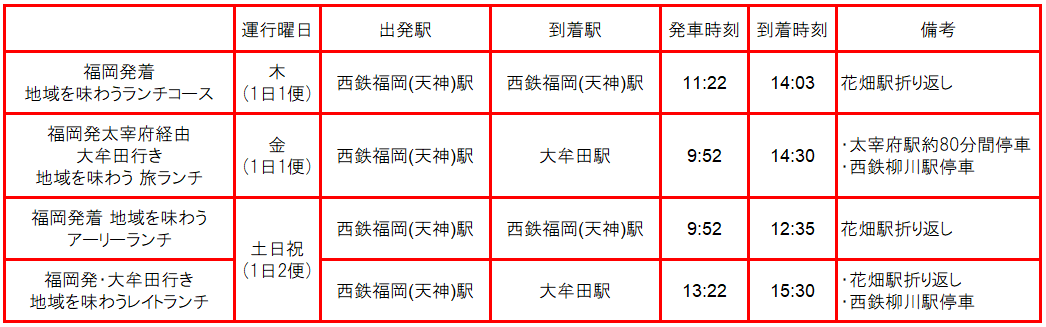 3月22日(金)は新コース「‐福岡発太宰府経由大牟田行き‐地域を味わう旅ランチ」の運行を開始します。新コース運行開始を記念し、太宰府駅にて、筑紫台高等学校吹奏楽部による演奏の中、駅員や太宰府観光協会の方々がご乗車のお客さまを盛大にお出迎えします。