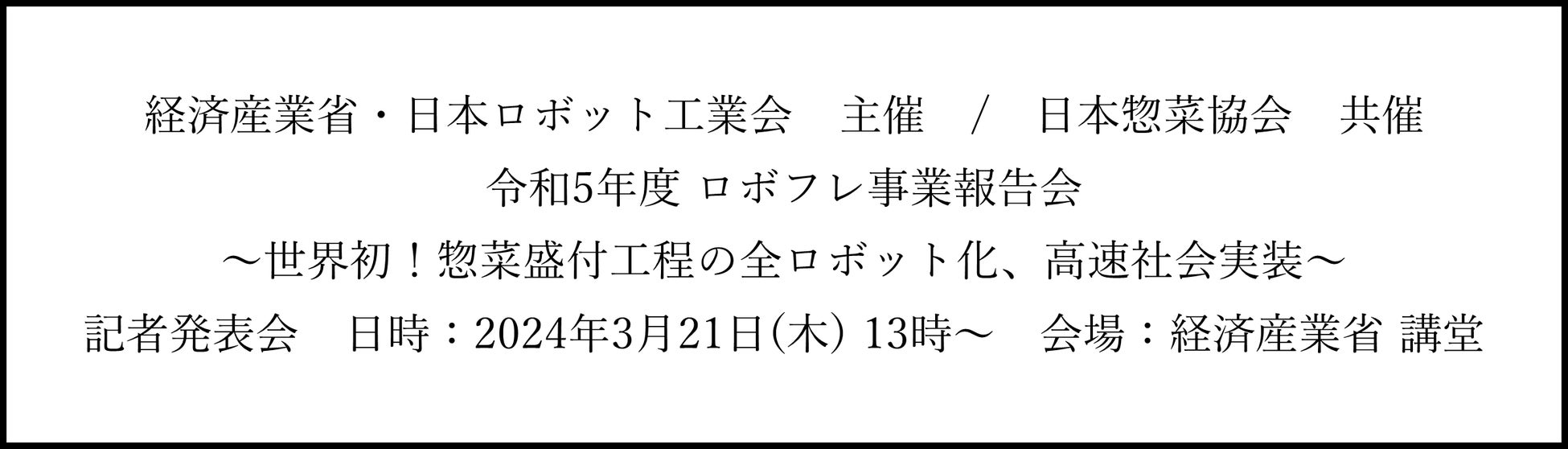 こういった2023年度の取り組みに対して、経済産業省と一般社団法人日本ロボット工業会の主催で、実際の研究開発に携わった日本惣菜協会・最先端技術企業各社・惣菜製造企業各社と食品産業を所管する立場から技術導入を推進している農林水産省が集結する記者発表会(報道関係の方対象)を行いますのでお知らせいたします。