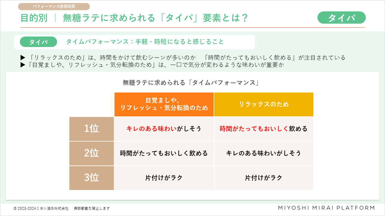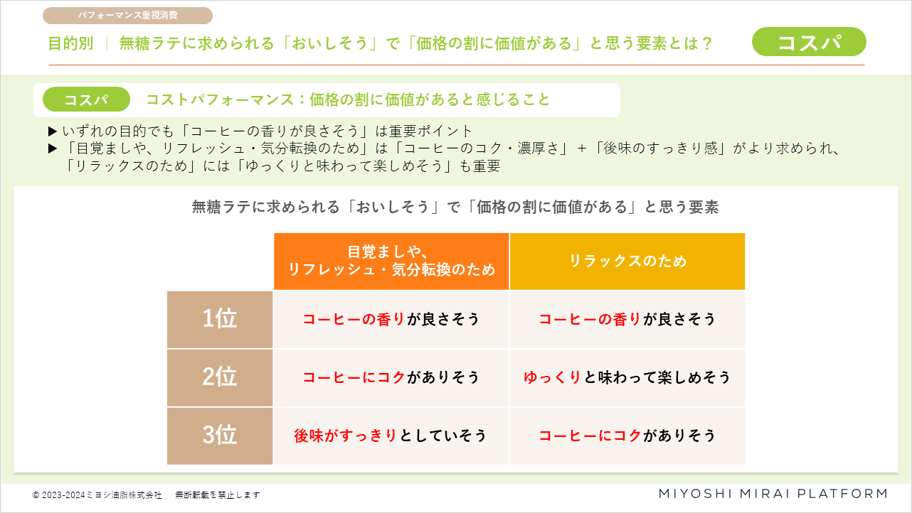 本調査では、消費者が無糖ラテを「目覚ましや、リフレッシュ・気分転換のため」、もしくは「リラックスのため」に飲むときに重視するパフォーマンスを調査し、いずれの場面でも「手軽であること」を最も重視していることが分かりました。また、本調査に加え、食事目的での植物ラテ購入時に求めるパフォーマンス関連の調査を実施し、植物ミルクが「濃厚そう」や「コクがありそう」だと「おいしそう」と感じる消費者が多いことが分かりました。さらに、ミヨシ油脂が独自に選出した2024年トレンドキーワードにもとづく飲料の分析結果やミヨシ油脂製品による課題解決策をレポートにまとめ、下記URLからダウンロードできます。