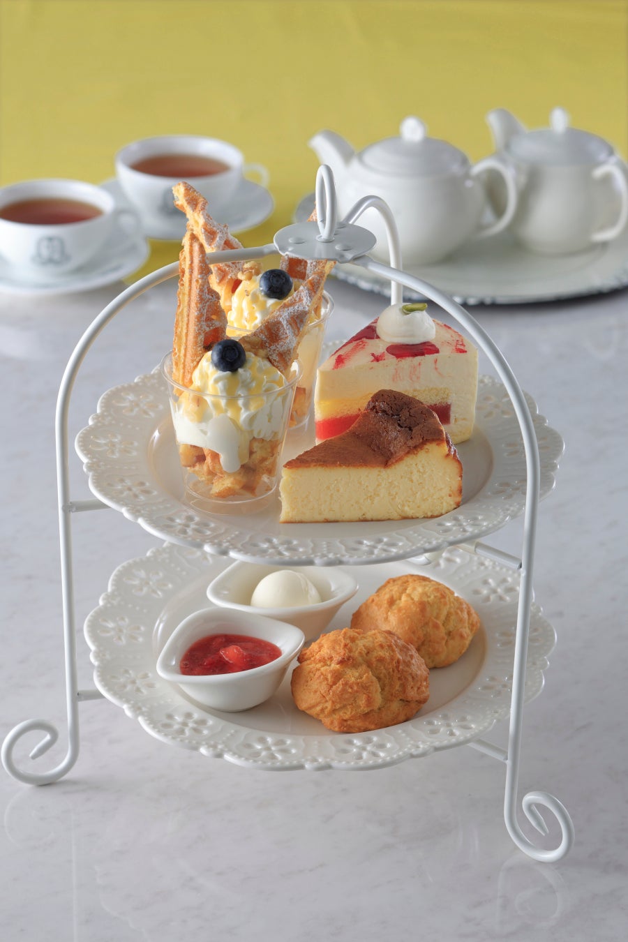 季節のケーキやミニパフェを紅茶で味わう贅沢な「アフタヌーンティーセット」です。上段には2種類のケーキに加え、レモンのワッフルミニパフェが並びます。下段のスコーンは、お好みで、クロテッドクリームやいちごジャムをつけてお召し上がりください。ドリンクはセット対象ドリンクの中からお選びいただけます。