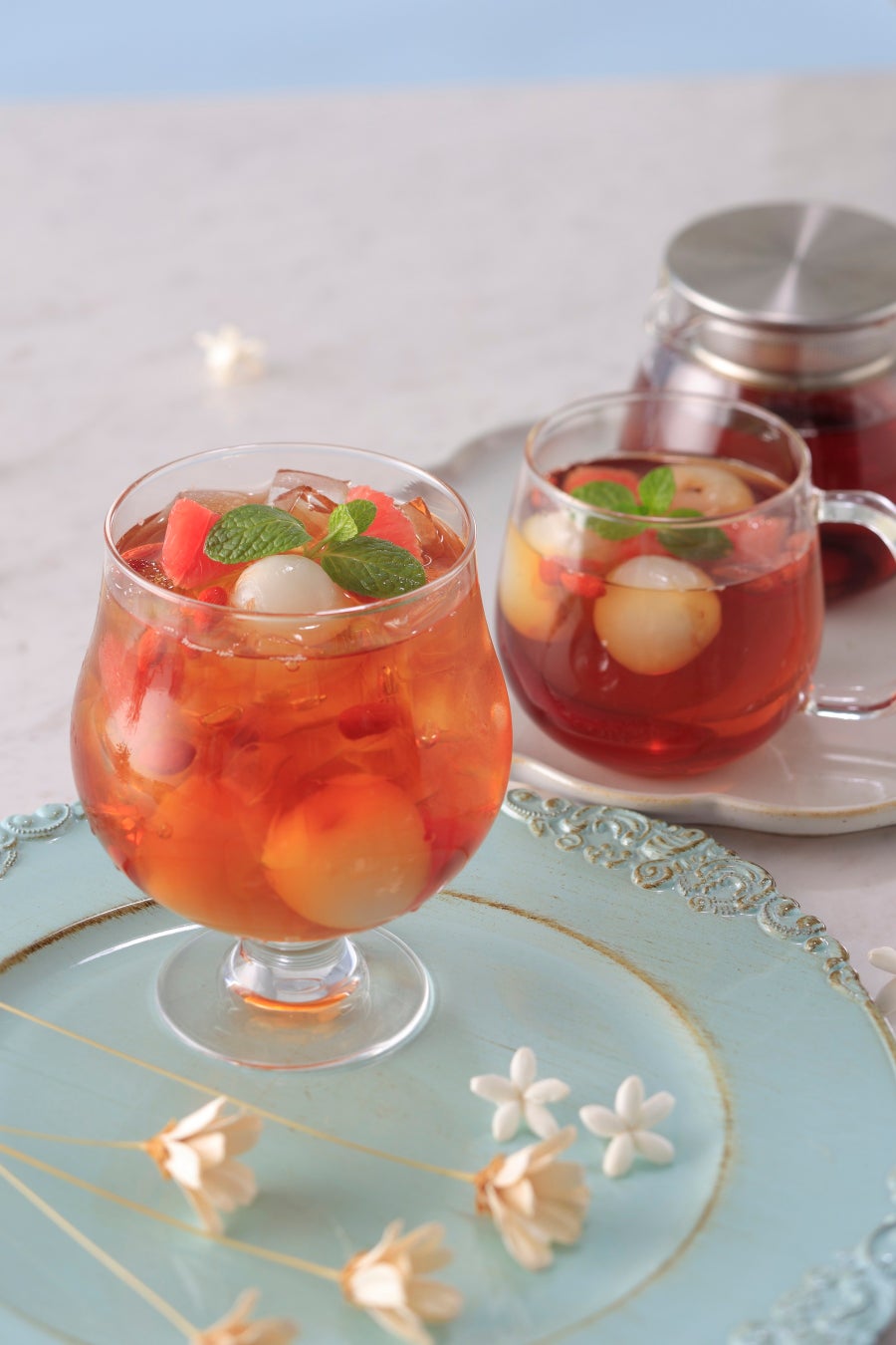 フルーティーなライチの香りと華やかなジャスミンの香りが優雅に広がるオリジナルフレーバーティー「ライチ&ジャスミン」に、ライチの果実と甘酸っぱいルビーグレープフルーツ、クコの実を加え、ほんのりと甘みを感じる すっきりとした味わいに仕上げました。ホットとアイスの両方をご用意しています。