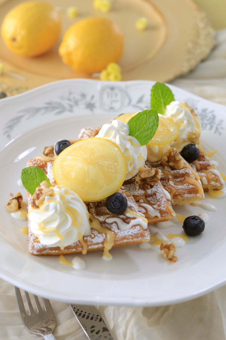 毎日お店で生地から作り上げるサックリとした食感のワッフルに、甘酸っぱいレモンとマスカルポーネヨーグルトソースを組み合わせた、さわやかで優しい味わいのワッフルです。トッピングには、ほろ苦いレモンのコンポート、食感の良いくるみ、ブルーベリーの彩りを添え、レモンの良さを活かした絶妙なバランスに仕上げました。紅茶との相性も楽しんでいただきたい、レモンが引き立つ春のさわやかスイーツワッフルです。