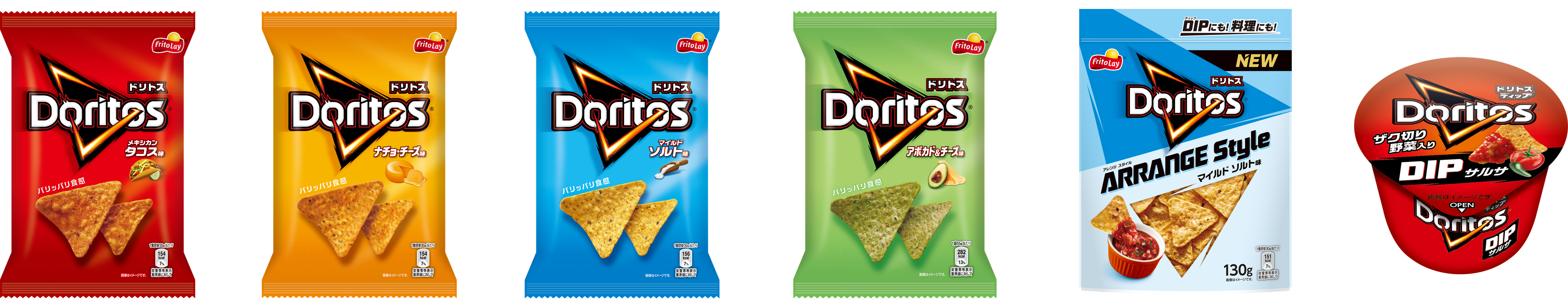 ドリトスの定番である「メキシカン・タコス味」「ナチョ・チーズ味」「マイルドソルト味」に加え、新たなフレーバーとして『ドリトス アボカド&チーズ味』と、料理にも最適な『ドリトス ARRANGE Style マイルドソルト味』が登場します。「マイルドソルト味」は、よりコーンの甘みと旨みを引き立てるマイルドな塩味をイメージさせるブルーのパッケージに一新。また、ドリトス専用ディップソース『ドリトス DIP サルサ』も併せてリニューアルし、トマトの濃厚な旨みをより感じられる味わいに仕上げました。