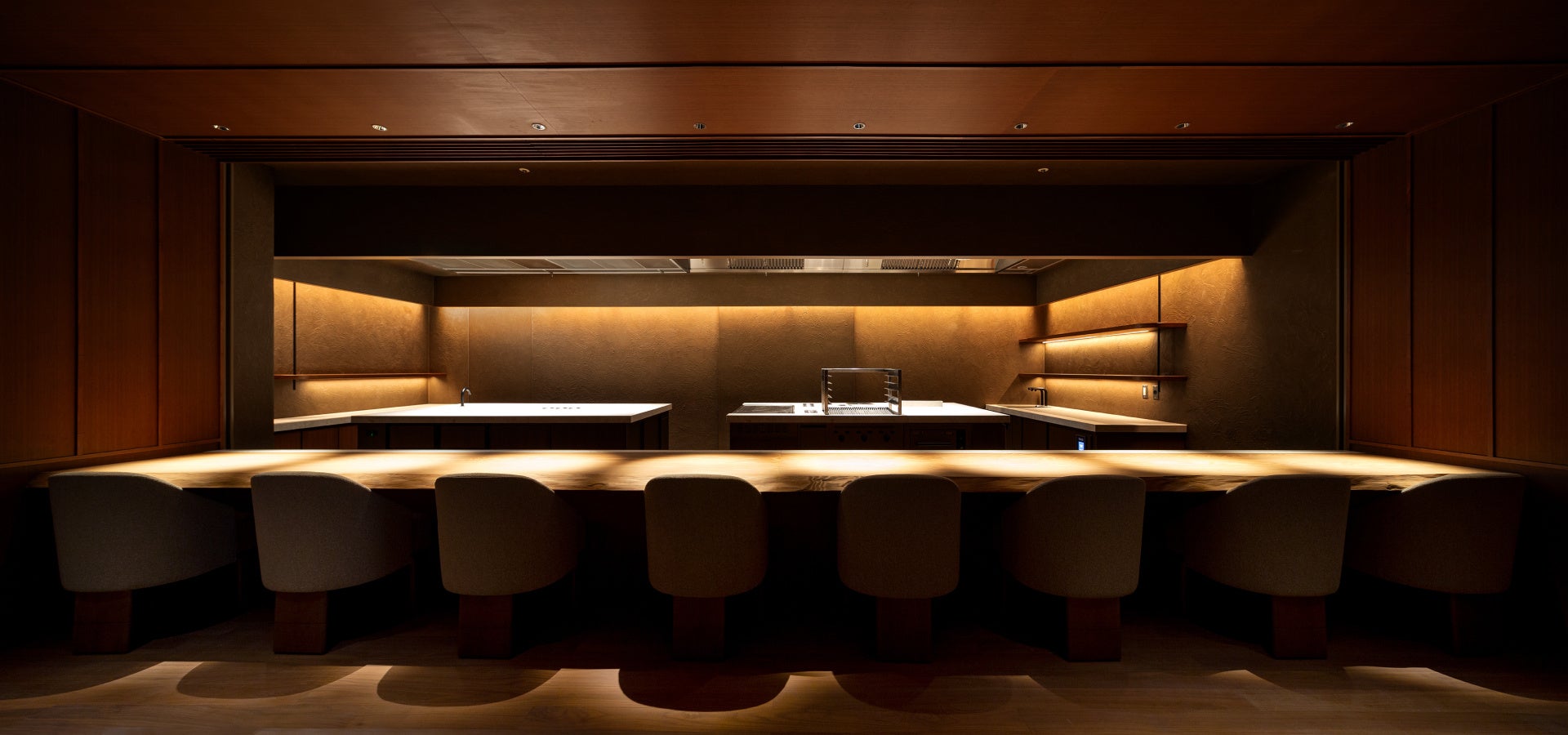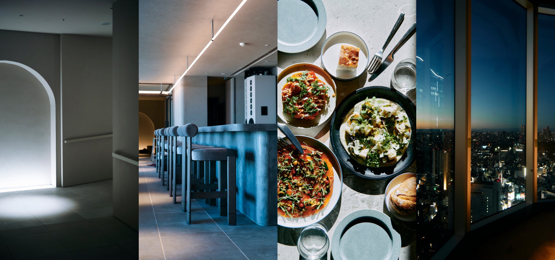 フロント、グリルダイニング、ミュージックバー、プライベートレストランの4つのエリアで構成され、エリア毎に専門性の高い業態と個性的な雰囲気を備えながら、光と影のグラデーションを活かした幻想的な空間デザインでフロア全体がゆるやかにつながっています。