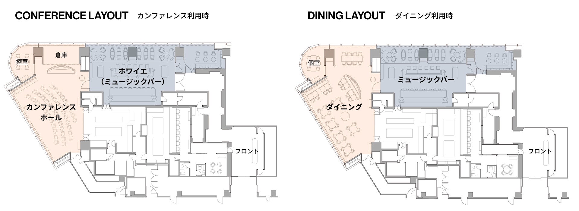 スペック:ミュージックバー 約132㎡・天井高 約2.6m、グリルダイニング 約125㎡・天井高 約4.1m