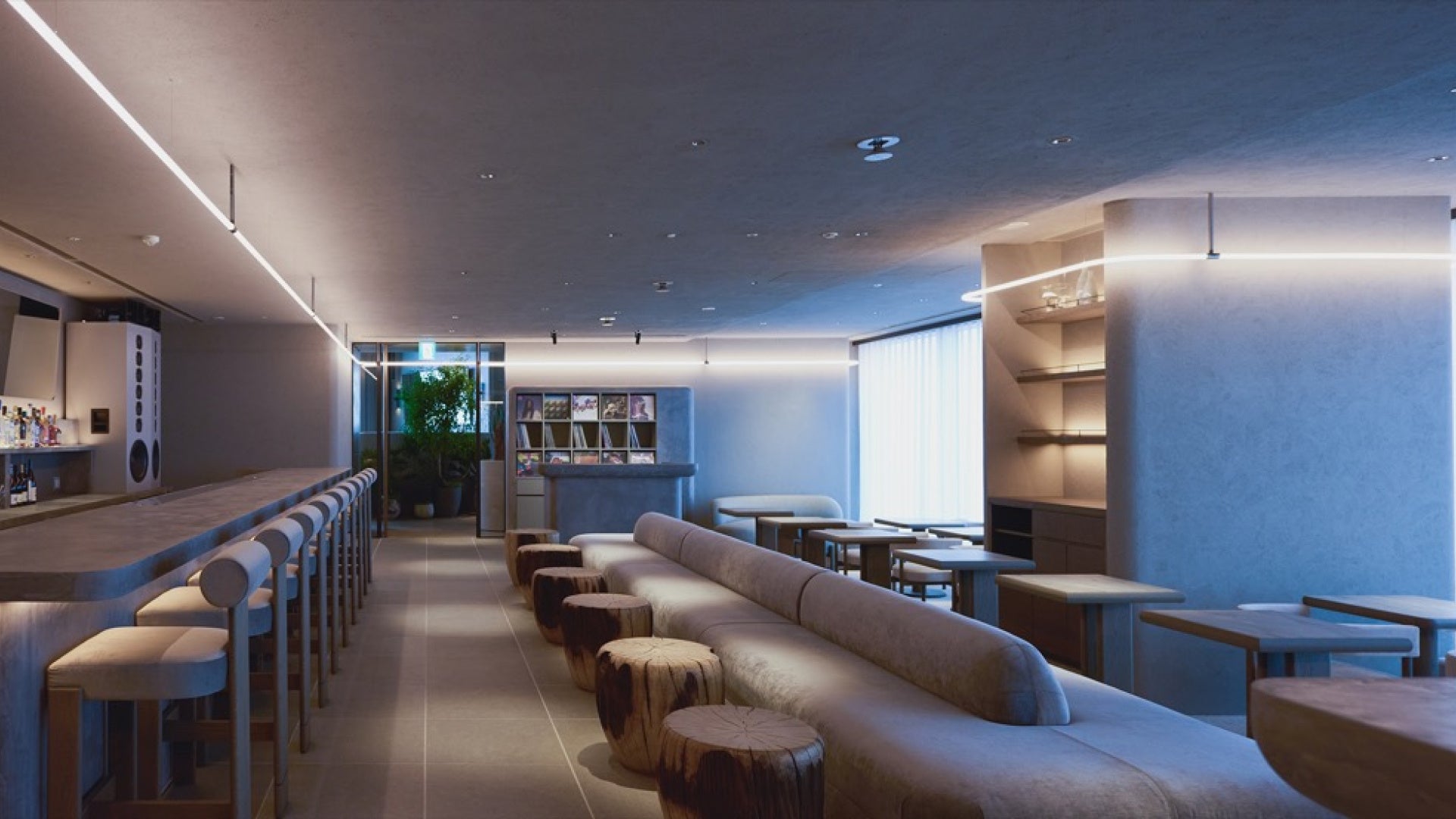 STEREOのインテリアは、光のグラデーションを空間化しています。フロントは、やわらかい光に包まれながら都市の喧騒から浄化される感覚を想起させ、奥へと続くミュージックバーは、飲食の穏やかな寛ぎと浮かび上がる空間の自然素材がゆるやかに混ざり合います。アートやスタイリング、BGMなどエリア毎に個性的なムードを演出しながらも、フロア全体として光の濃淡や色調の連続性を持たせることで、STEREOならではの総合的なカルチャー体験へと導いていきます。