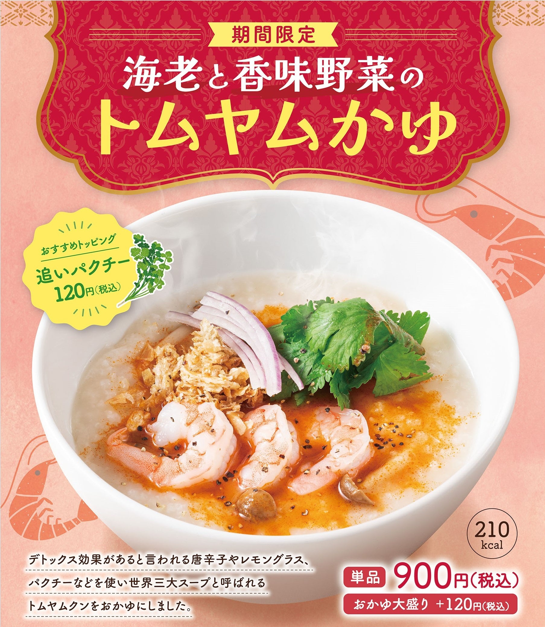 2001年の創業以来、滋味深い本格中華粥を日本人の嗜好に合わせた“オリジナルの中華粥”として数多く提案してきた「粥餐庁」が、この春にご提供するのは、世界三大スープとも称されるタイ王国のスープ料理「トムヤムクン」スタイルの本格中華粥。唐辛子やレモングラス、パクチーなどの辛味・酸味・香りの絶妙なバランスが本格中華粥の旨みを引き立てる、“新感覚のおかゆ”です。