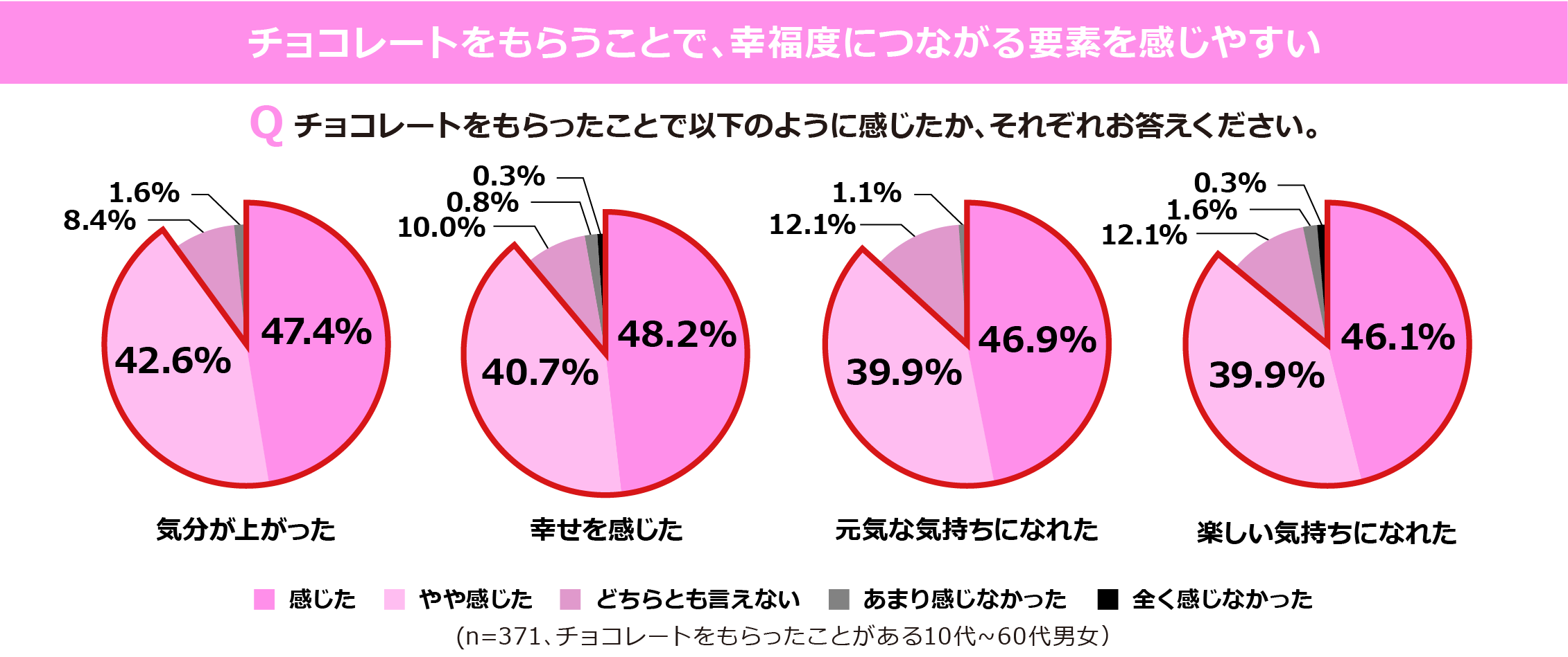 また、チョコレートをもらったことがある人に、もらったことでどう感じたか聞いたところ、 9割近くが「気分が上がった」「幸せを感じた」と回答しました。さらに8.5割以上が「元気な気持ちになれた」「楽しい気持ちになれた」と回答し、もらうことは渡すこと以上に、前向きな気持ちの向上に寄与しており、幸福度向上につながっている可能性が考えられます。