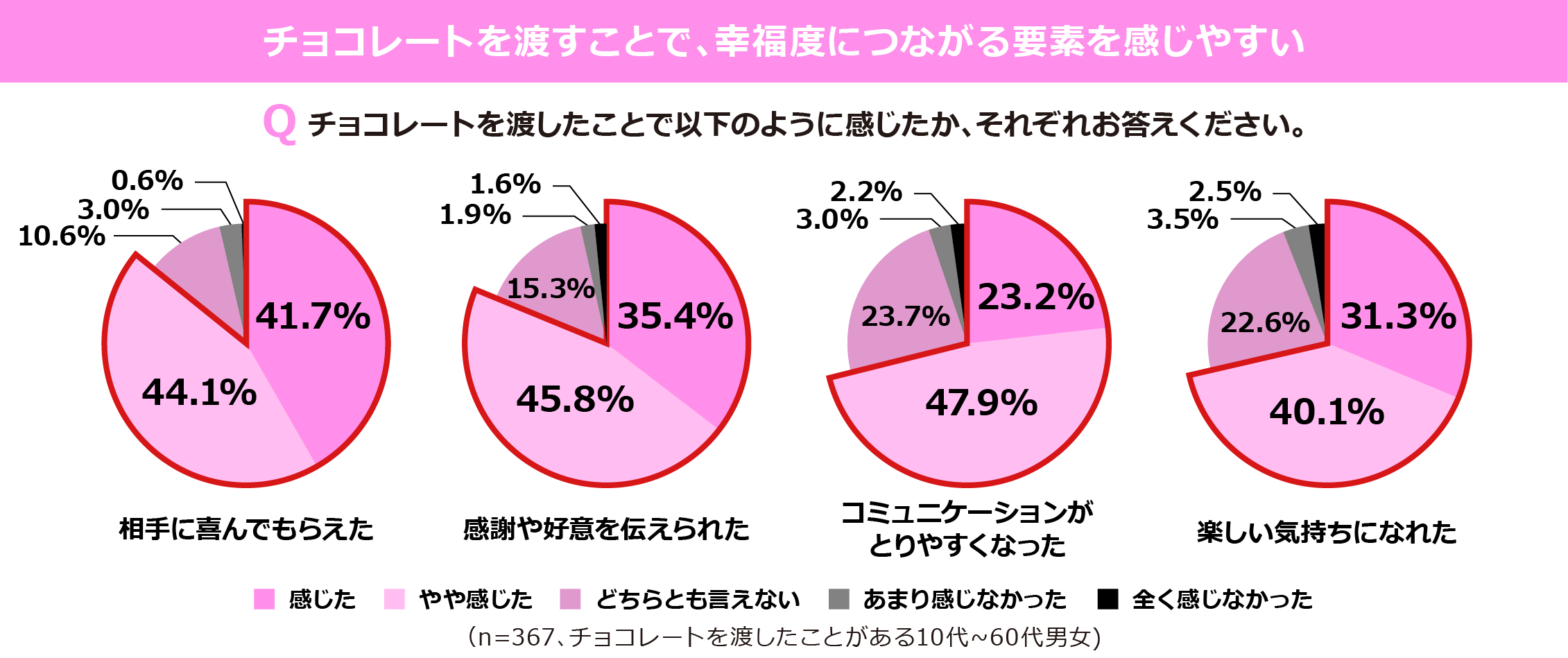 今回の調査から、チョコレートを渡す・もらうことで、「相手に感謝や好意を伝えられる」「前向きな気持ちの向上」といった幸福度につながる要素を感じることがわかり、さらに、幸福度の高低にも影響している可能性が明らかになりました。