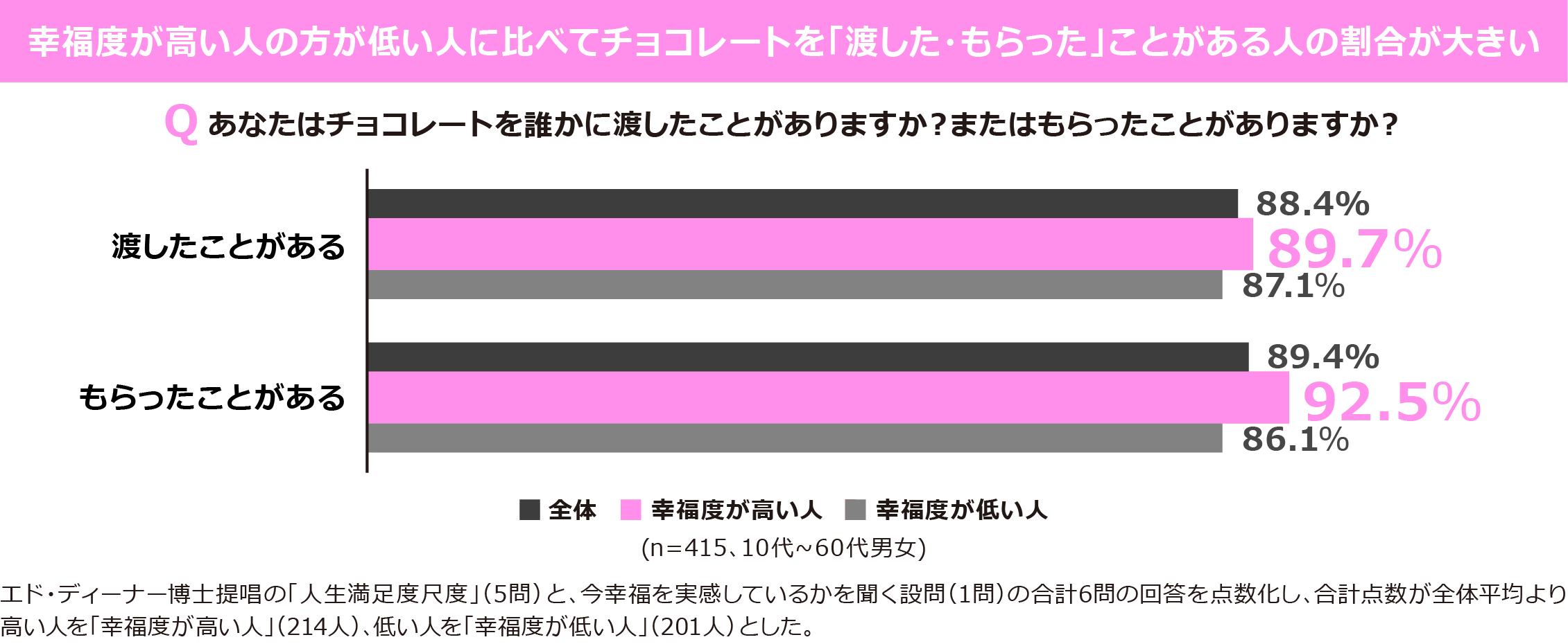 また、幸福度が高い人の方が低い人に比べてチョコレートを渡した・もらったことがある人の割合が大きい傾向が見られ、もらったことがある人の差は6.4ptという結果になりました。チョコレートを渡す・もらうことが幸福度向上と関係している可能性が考えられます。