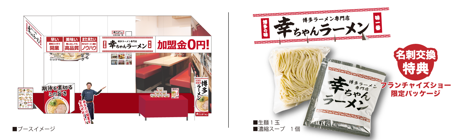 イベント当日は、収支モデルや店舗運営についてご説明させていただくほか、実際のお店の雰囲気を感じられるよう、メニュー看板や暖簾、のぼりを設置し、パネルで店舗の内観を再現した臨場感のあるブースで皆様をお待ちしております。また、開催期間中、名刺交換をさせて頂けた方、もしくは来場者証QRコードを読み取らせて頂けた方各日先着200名様に、幸ちゃんラーメン1食分を進呈いたしますので、事業や商品の魅力を知っていただく機会としてご来場の際はぜひブースにお立ち寄りください。