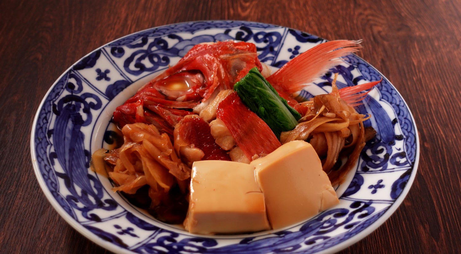 旨みのある脂が堪能出来る金目鯛の煮付けは、板前が特にお勧めする一品です。煮汁も楽しめるよう、ようにガリやごぼう、豆腐などもお入れしました。