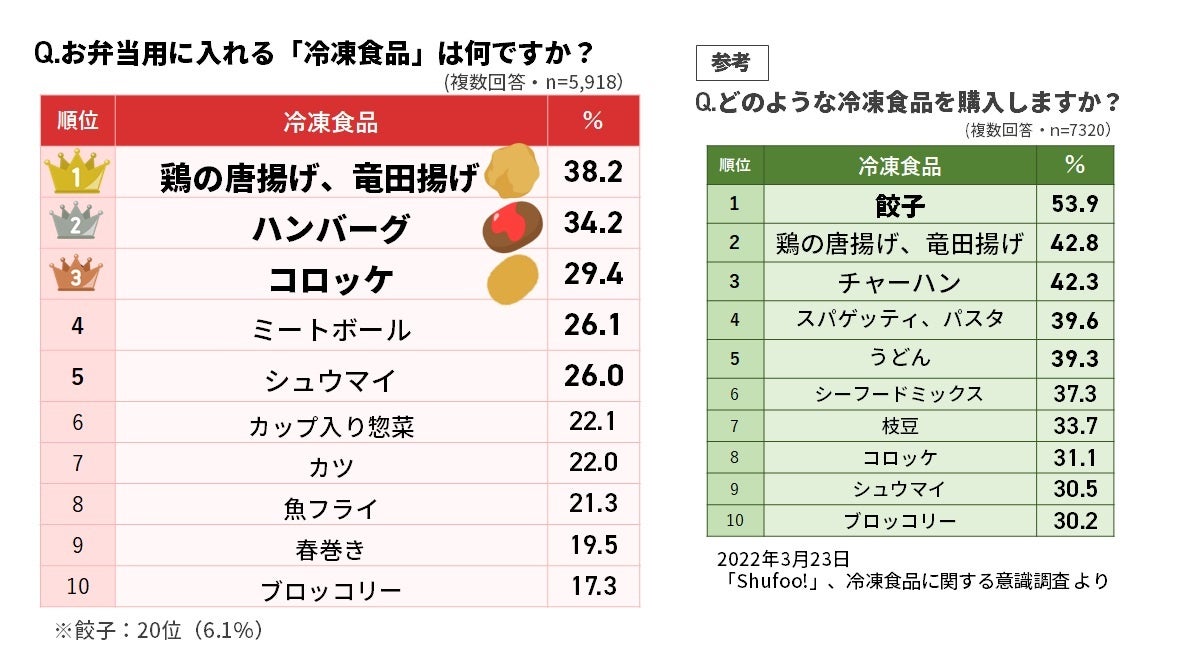 忙しい朝、お弁当作りの味方になってくれるのは「冷凍食品」です。そこで、お弁当に入れる冷凍食品を聞いてみました。1位は「鶏の唐揚げ/竜田揚げ」(38.2%)でした。前項の定番おかずの3位にもランクインしています。2位は「ハンバーグ」(34.2%)、3位は「コロッケ」(29.4%)でした。お弁当に便利な小さなサイズのものも売られています。いずれも手作りをするにはひと手間かかる惣菜が人気です。なお、2022年にShufoo!が調査した「冷凍食品に関する意識調査」では餃子がトップでした。夕食の一品として利用するシーンが多い一方で、お弁当に入れるおかずとしては、にんにくやニラなどの匂いが気になることと、レンジ調理ではなくフライパンで焼かないといけないためか、20位にとどまっています。