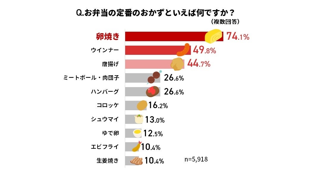 2位「ウインナー」(49.8%)、3位「唐揚げ」(44.7%)、4位「ミートボール・肉団子」「ハンバーグ」(ともに26.6%)と、肉系や揚げ物が上位にランクインしています。人気のおかずばかり入れてしまうと、美味しいけれど茶色い「地味弁」になってしまうのも悩みの1つかもしれません。