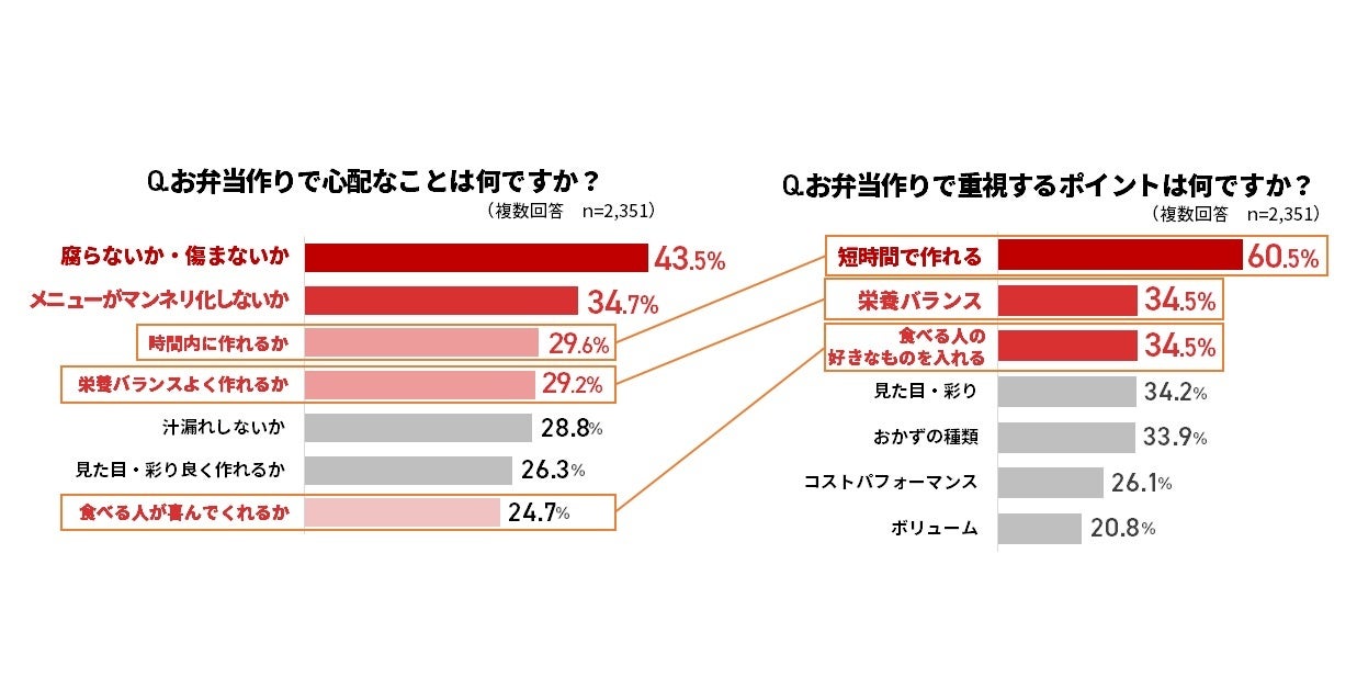 お弁当作りで重視するポイントも聞いてみました。トップは「短時間で作れる」(60.5%)でした。心配事の3位にも「時間内に作れるか」(29.6%)が入っています。前々問の通り、20分未満で準備する人が大半という結果からも、お弁当は時間との勝負ということがわかります。また、重視するポイントの2位は「栄養バランス」(34.5%)でした。栄養バランスが良いお弁当を作るのはなかなか難しいもの。こちらも心配事の4位「栄養バランスよく作れるか」(29.2%)としてランクインしています。同率2位「食べる人の好きなものを入れる」(34.5%)も「食べる人が喜んでくれるか」(心配事7位 24.7%)という心配の現れといえます。