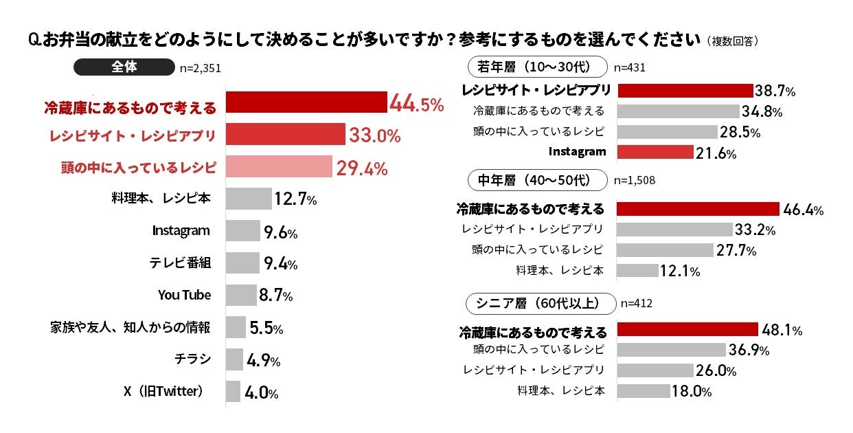 お弁当の献立決めの際に参考にするものを聞いたところ、全体のトップは「冷蔵庫にあるもので考える」(44.5%)でした。冷蔵庫にあるものだけで作る「アルモンデ弁当」はSNSでも話題になっています。年代別に見ると、40代以上(中年層、シニア層)のベテラン層ではそれぞれトップです。