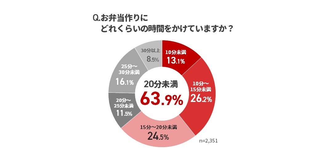 さらにお弁当作りにどれくらい時間をかけているか聞いたところ、「10分~15分未満」が最多で26.2%、次いで「15分~20分未満」が24.5%でした。6割以上の人が20分未満でお弁当を準備していることがわかります。
