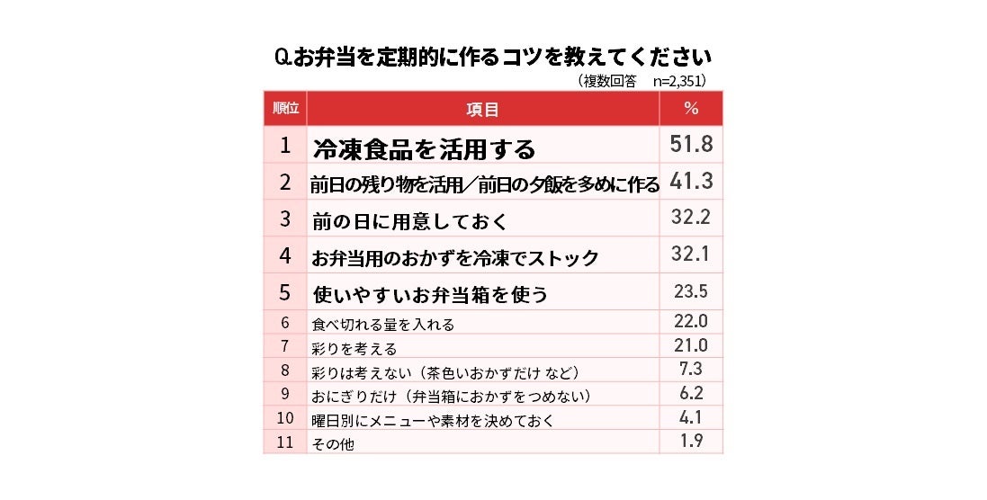 トップは「冷凍食品を活用する」で半数以上(51.8%)の人が挙げています。また4位には「お弁当用のおかずを冷凍でストック」(32.1%)がランクイン。冷凍を使いこなすことがお弁当作り攻略のテクニックの1つのようです。