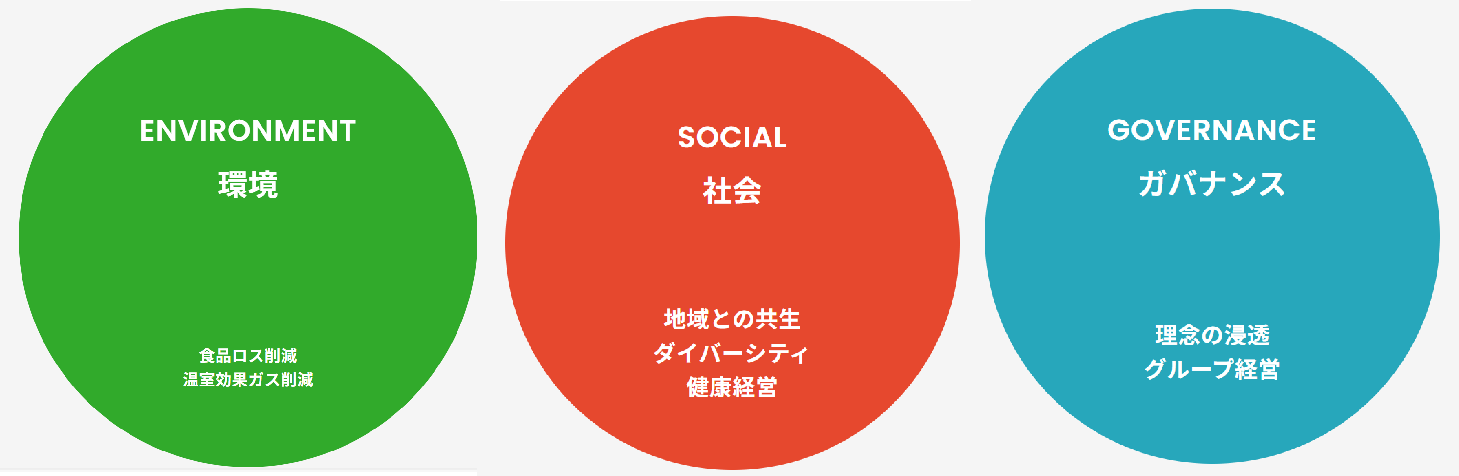 「Eat+&の幸せ」を、将来へと持続させていくために、「事業への影響」と「社会への影響」を考慮した「マテリアリティ(重点課題)」に基づき、「環境」「社会」「ガバナンス」の3つの視点より、7つの重点取組みテーマを選定いたしました。