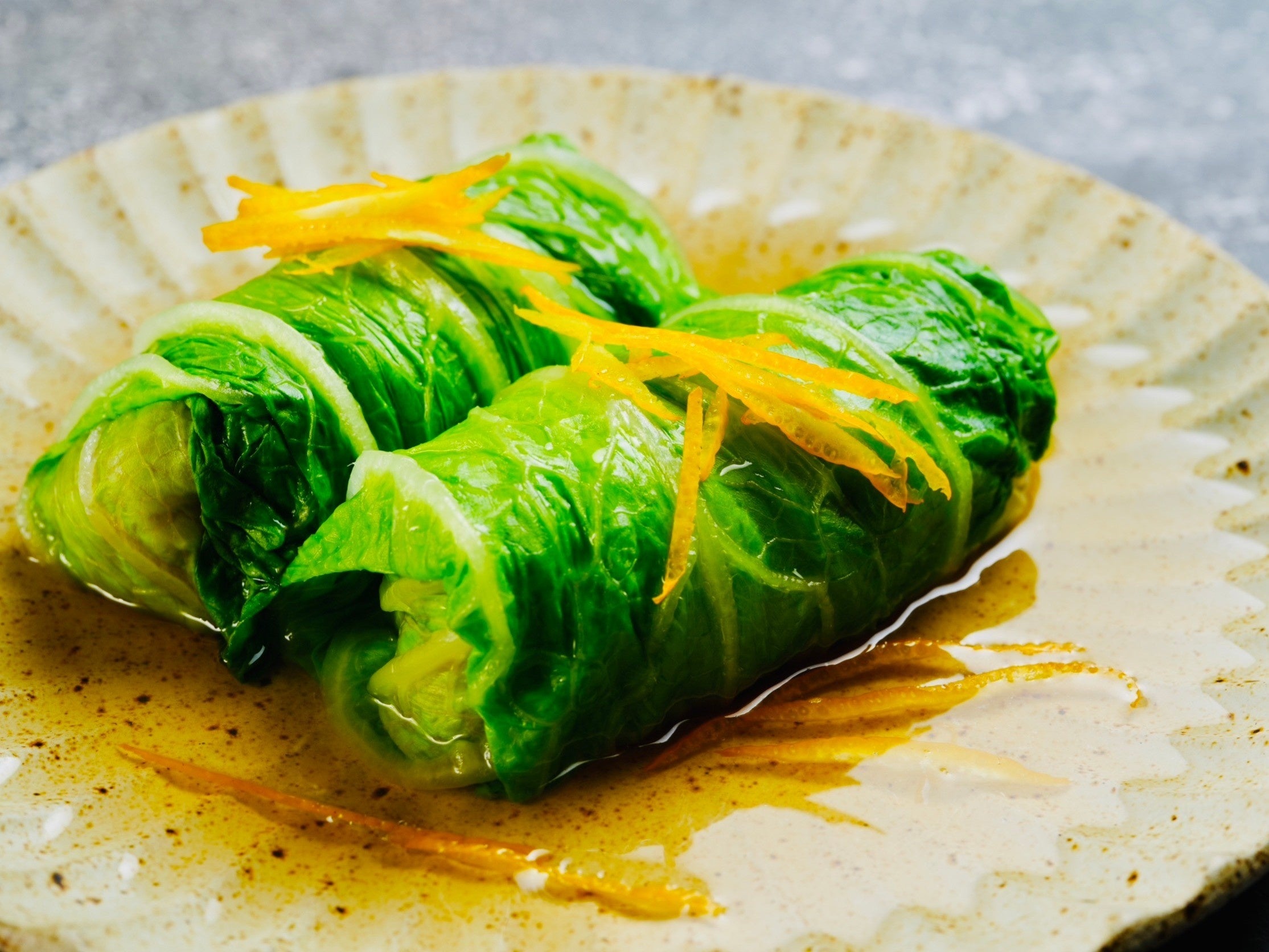 鶏出汁で柔らかく炊いた産地から届く旬のお野菜をビストロアレンジ。春の訪れを感じるヘルシーな料理。