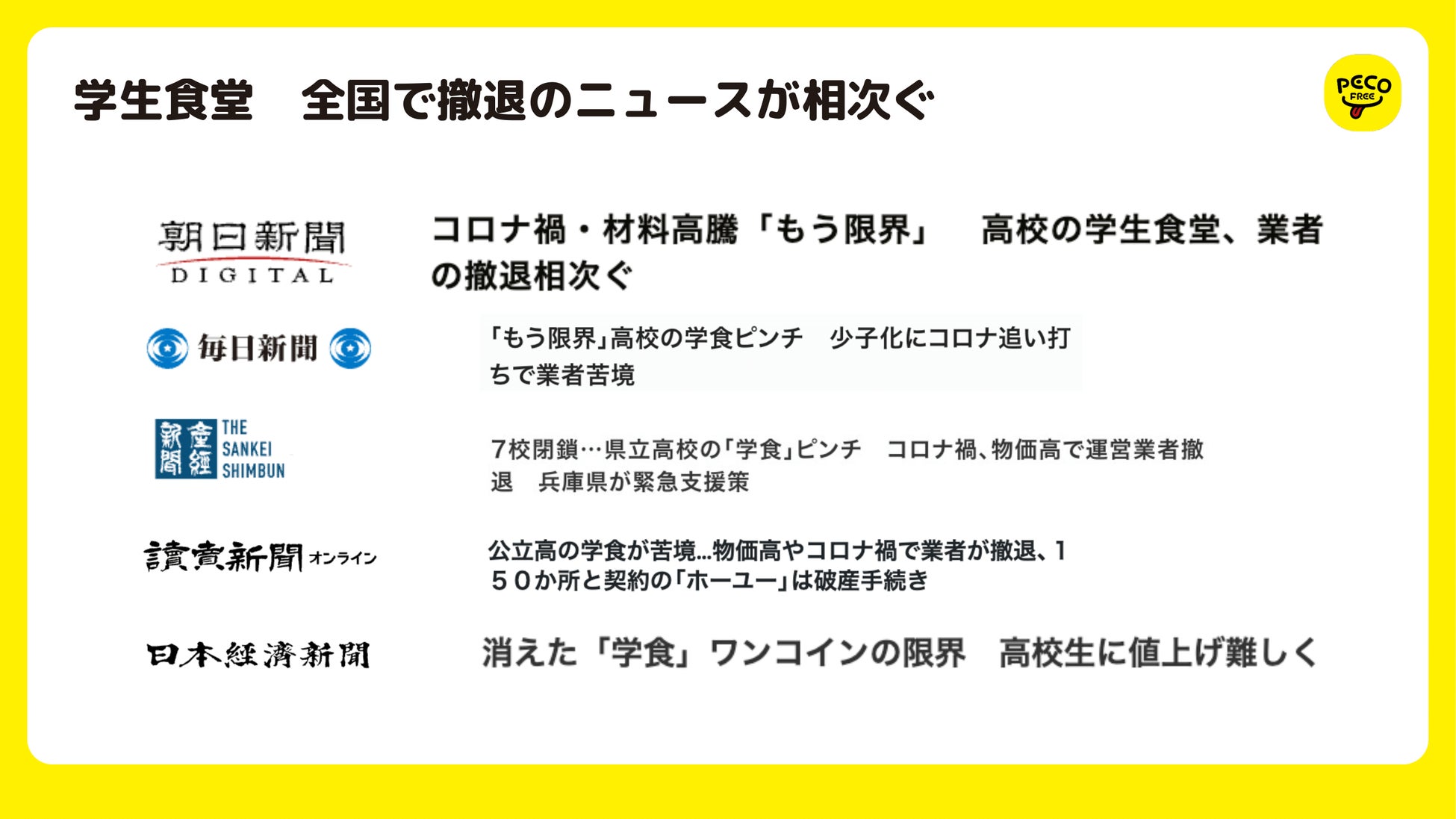 日本の誇るべき文化である「給食」の新しい在り方を提案するPECOFREEサービスは、全国の学校・学童に広がりつつあります。近年、学校の昼食を取り巻く環境は大きく変化しており、学生・生徒のスクールライフを昼食から充実させるために、PECOFREEサービスが引き続き着実に進化していくよう最善を尽くします。