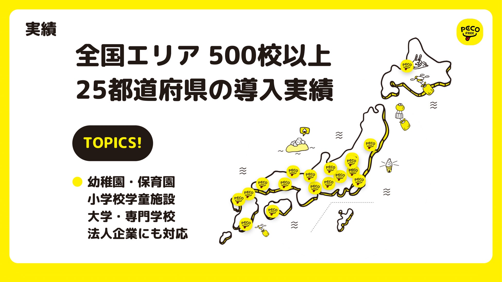 PECOFREEは、産業給食業界におけるデジタル化を推進し、収益化可能なシステムを構築することで、社会性と事業性を兼ね備えた食のインパクトを生み出すスタートアップとして、現在全国展開しています。2021年4月のサービス開始以来、約3年間で学校、学童保育、企業を含む500施設以上の導入が決定し、特に学校施設における導入は今期に入り2.5倍の加速を見せています。