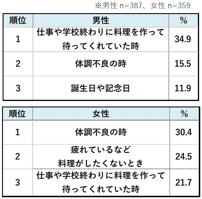■男女の1位は「料理を作って待ってくれていた時」と「体調不良の時」男性と女性で意識の違いあり