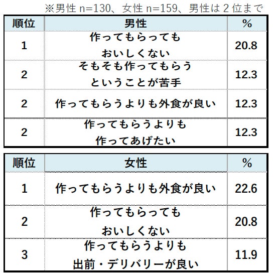 「うれしくない」/作ってもらうよりも一緒に作りたい、作ってもらうよりも作ってあげたい、そもそも作ってもらうということが苦手、作ってもらってもおいしくない、作ってもらうよりも外食が良い、作ってもらうよりもスーパーやコンビニ、テイクアウトが良い、作ってもらうよりも出前・デリバリーが良い、その他【自由回答】