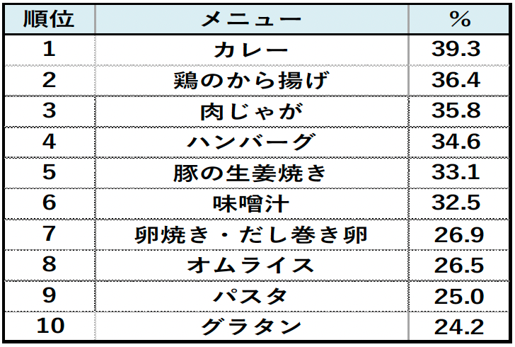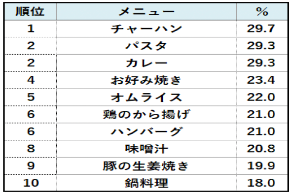 ※提示した選択肢:ロールキャベツ、グラタン、パスタ、味噌汁、豚の生姜焼き、肉じゃが、鶏のから揚げ、オムライス、ハンバーグ、カレー、卵焼き・だし巻き卵、とんかつ、親子丼・かつ丼などの丼物、天ぷら、エビフライ、筑前煮、豚の角煮、サバの味噌煮、ぶり大根、焼き魚、きんぴらごぼう、うどん、チャーハン、ラーメン、餃子、ポテトサラダ、鍋料理、ステーキ、ピザ、エスニック料理、お好み焼き、もんじゃ、寿司(ちらし、手巻きなど)、サンドイッチ、BBQ、その他【自由回答】